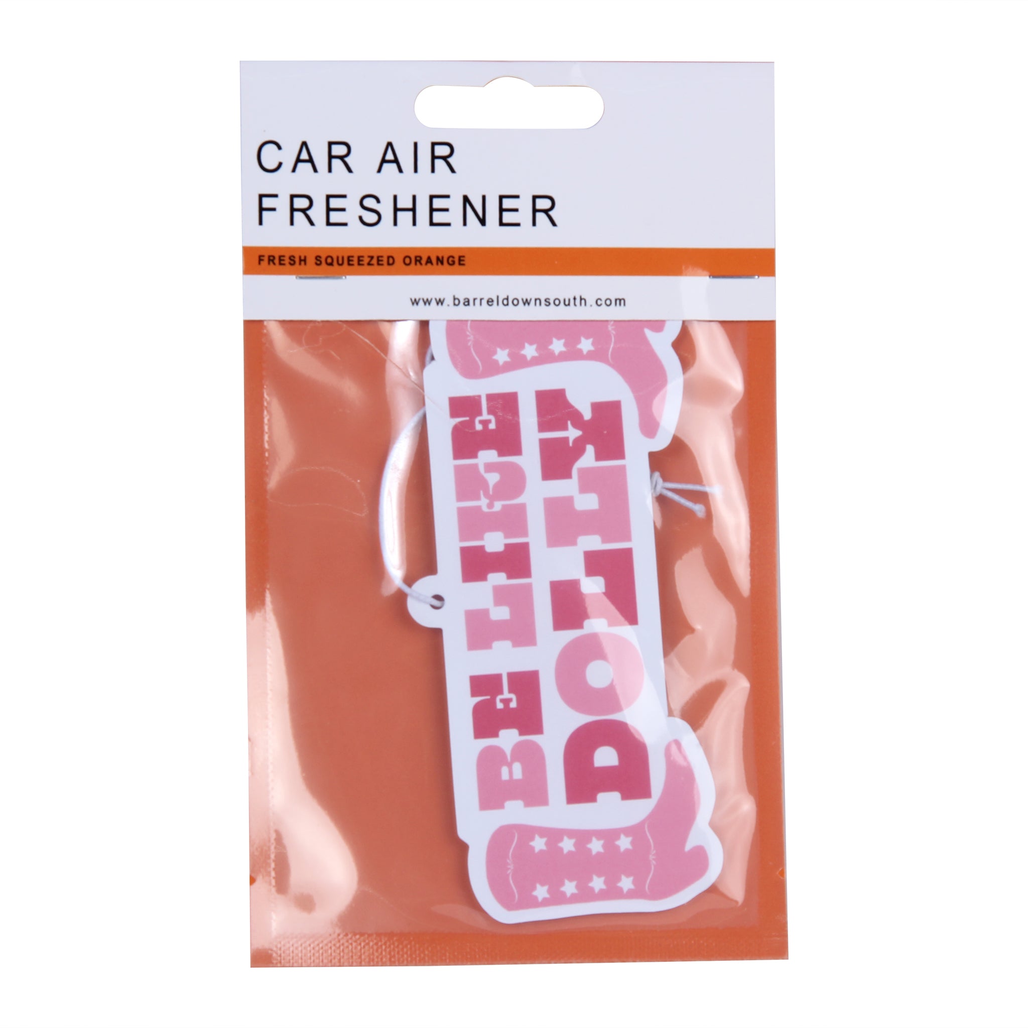 Keep your car smelling fresh with a touch of country charm. This Be Like Dolly Air Freshener features the iconic phrase "Be Like Dolly" nestled between two pink cowboy boots, a fun nod to the queen of country herself. Perfect for Dolly fans and anyone who loves a little Southern sass on the road. Hang it from your rearview mirror and let that good vibes energy ride shotgun with you.