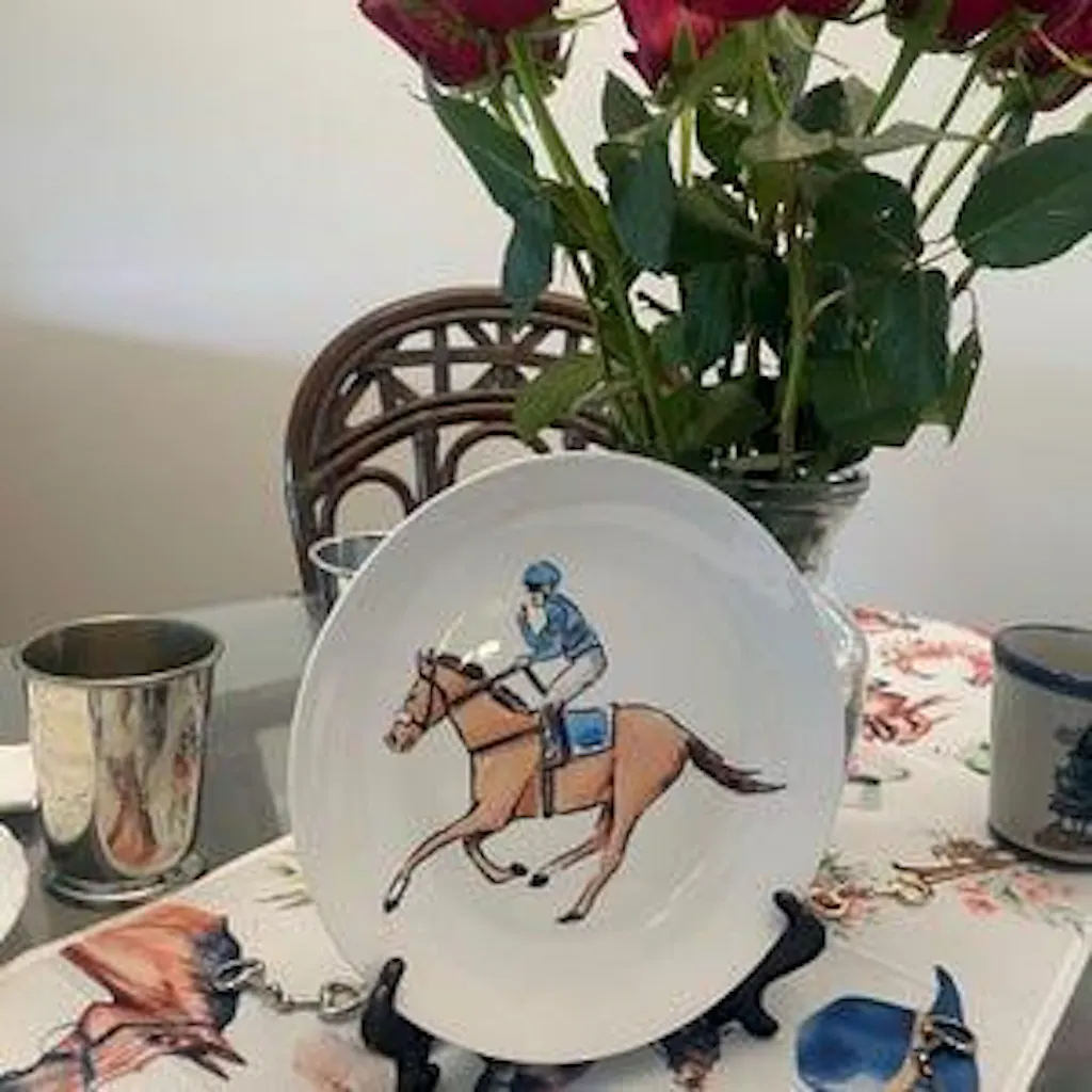 Saddle up for some serious style with this charming derby-themed Cheering Blue Horse Plate! Featuring a spirited blue-clad jockey astride a magnificent horse, it's the perfect piece for adding a touch of racing heritage to your table or display. Whether you're a thoroughbred enthusiast or simply love equestrian charm, this playful plate celebrates the thrill of the track in timeless ceramic. A winner's circle essential for collectors and horse lovers alike.