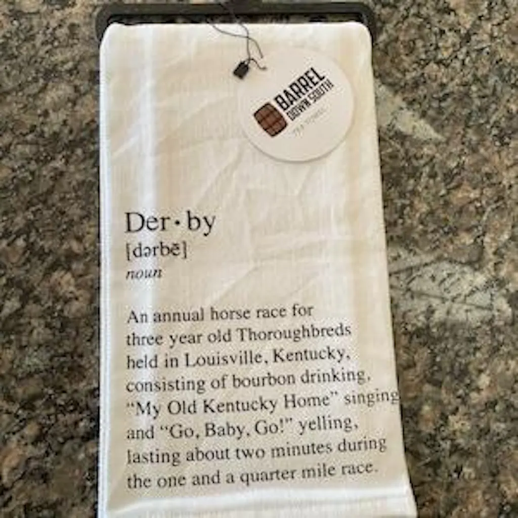 Bring a dash of Southern wit to your kitchen with this charming Define Derby Tea Towel featuring a dictionary-style definition of "Derby." Perfect for horse racing enthusiasts and bourbon lovers alike, it combines humor with practicality. Whether you're drying dishes or displaying it as kitchen décor, this playful piece celebrates the spirit of the Derby with clever wordplay. A fun conversation starter that adds personality to any home.