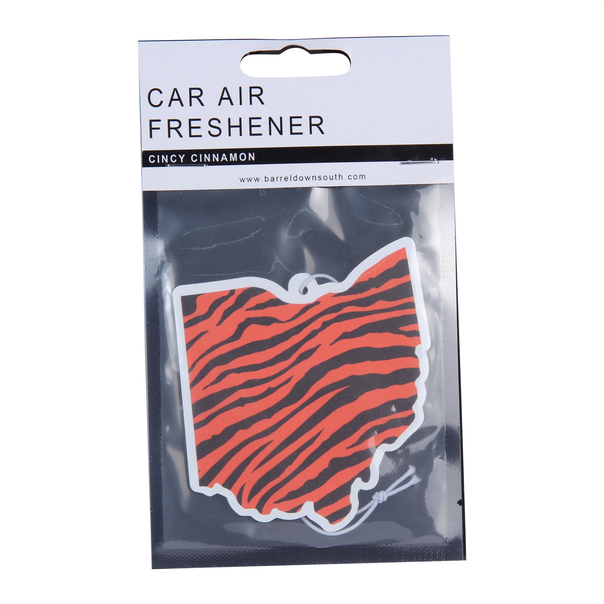 Keep your car smelling fresh with this quirky Ohio Stripe Shape Air Freshener! Featuring a bold tiger stripe pattern that fills the entire state silhouette, it's the perfect accessory for Ohio natives and fans alike. Hang it from your rearview mirror to add a playful touch of regional pride to your ride. Long-lasting fragrance keeps your vehicle smelling great mile after mile.