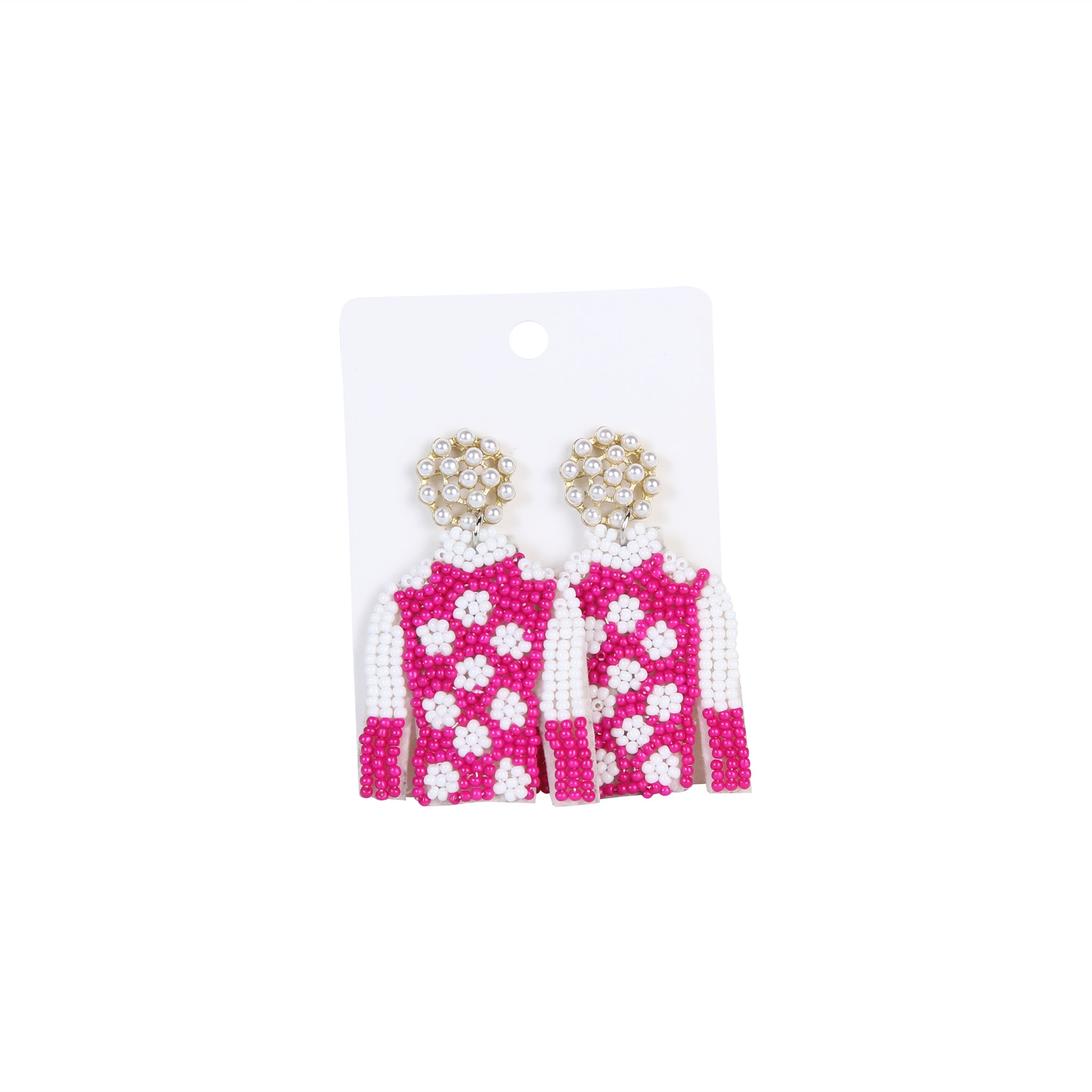 The classic combination of pink and white hues, accentuated by the intricate Jockey Silk pattern, makes these earrings a perfect accessory to complement your Derby Day attire. The use of party seed beads adds a touch of whimsy and charm, ensuring that these earrings stand out in any crowd.
