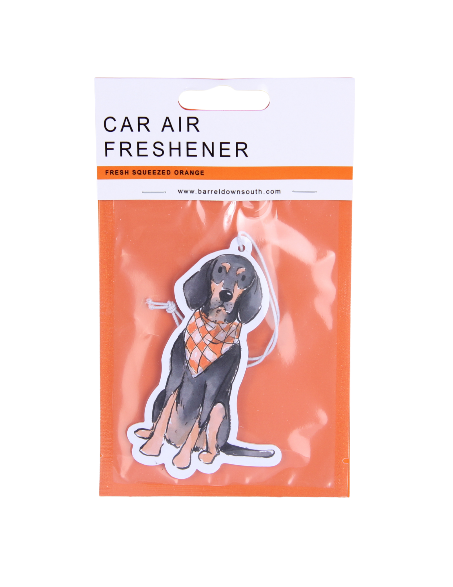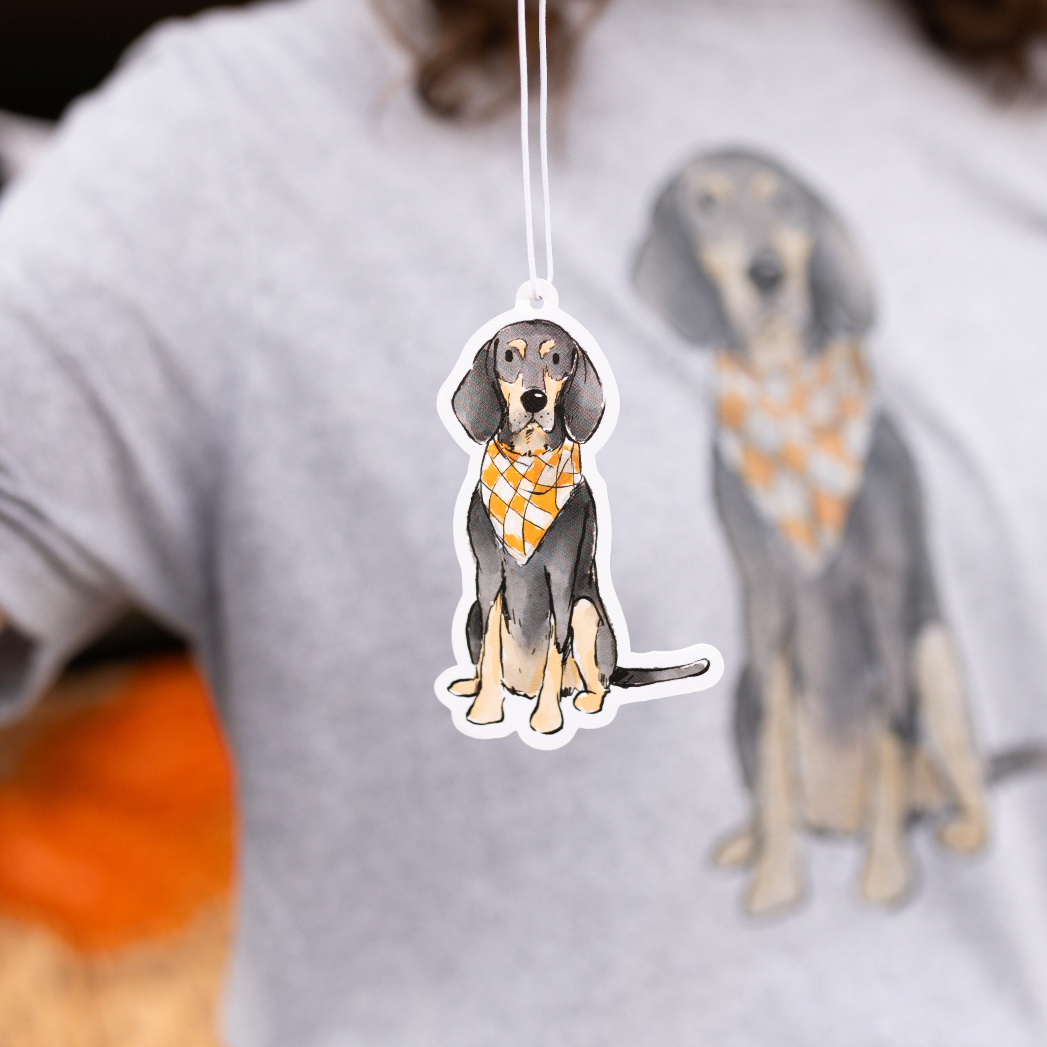Bring a touch of Tennessee charm to your ride with this delightful Bluetick Coonhound Sitting Air Freshener. Our sitting pup sports a vibrant orange and white checkerboard bandana that captures authentic Southern style. Perfect for dog lovers and Vol fans alike, this playful freshener adds personality to your car while keeping it smelling fresh. A fun conversation starter that celebrates the spirit of the South—because every drive deserves a little hound dog charm!