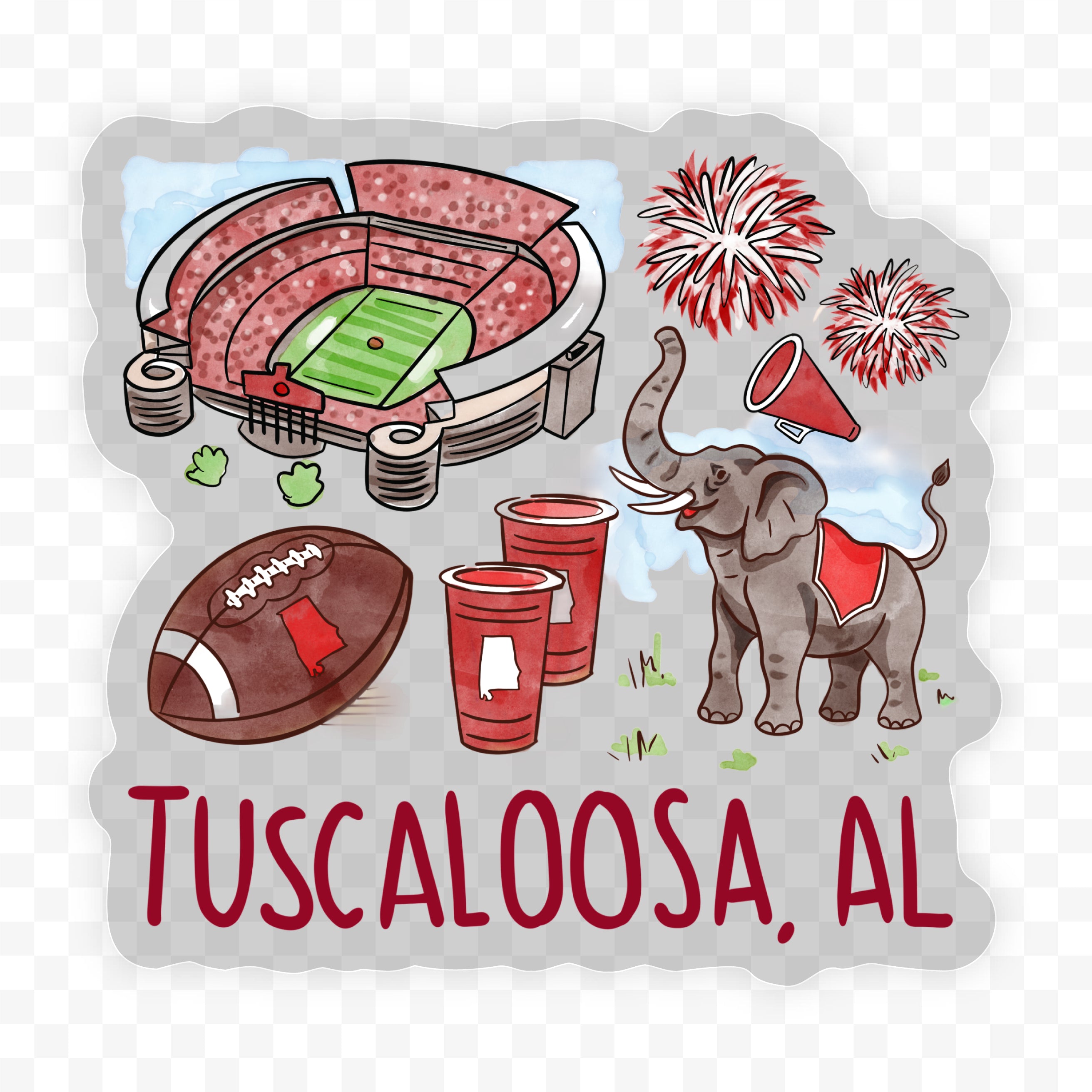 Show your Tuscaloosa, Alabama, pride with this colorful game day sticker. Featuring hand-drawn illustrations of a stadium, elephant, pom-poms, megaphone, football, and state-themed cups, it’s the perfect accessory for celebrating football season in style.