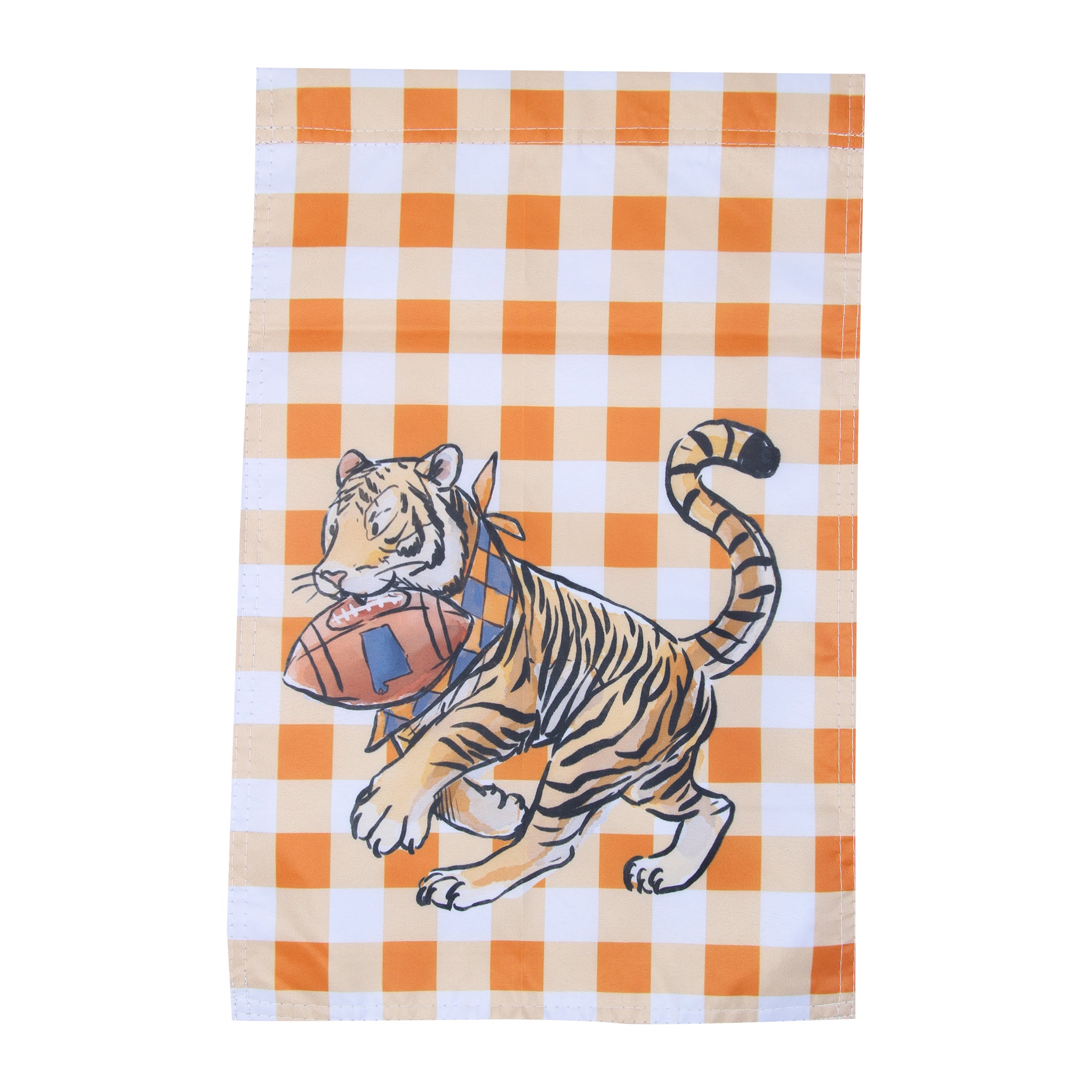 Bring bold game day spirit to your yard or porch with this Orange Plaid Tiger AL Garden Flag. Featuring a hand-drawn tiger proudly carrying a football against a vibrant orange-and-white checkered background, this design adds a playful yet fierce touch to your outdoor décor. Perfect for tailgates, outdoor gatherings, or simply showing off your team pride at home, this flag is made to withstand the elements while keeping its colors vivid all season long.