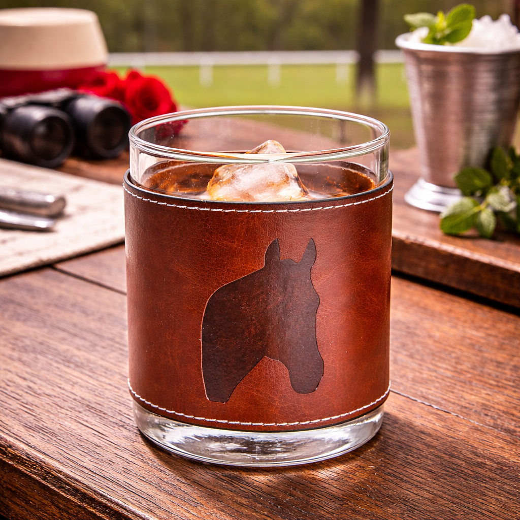 Kentucky Stacked Horse Racing Faux Leather Rocks Glass