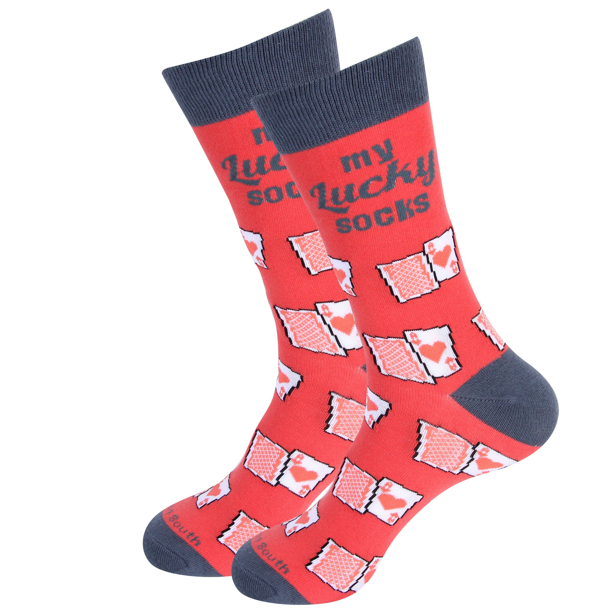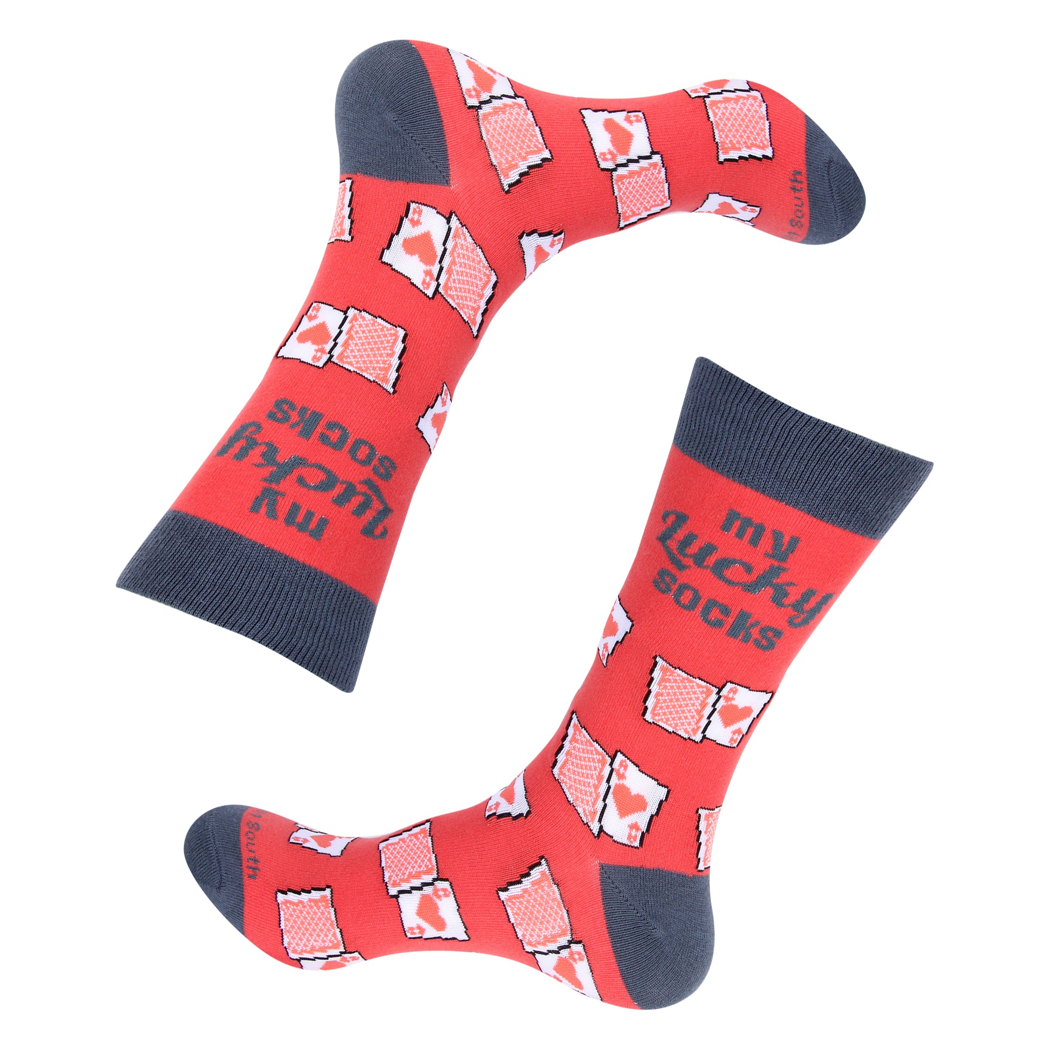 Step up your game with our bold My Lucky Card Socks, featuring a striking repeating pattern of classic playing cards set against a vibrant red background, paired with the confident phrase “My Lucky Socks.” Perfect for card sharks, casino lovers, and anyone who believes a little luck goes a long way, these socks add a winning touch to your everyday style.