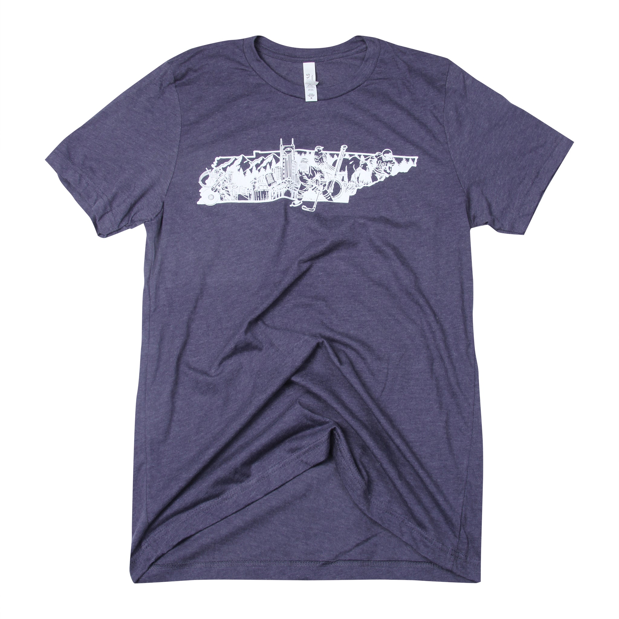 This heather navy tee highlights the state outline filled with hand-drawn illustrations of its most iconic symbols—from mountains and city skylines to music and sports. The intricate white graphic makes a bold statement, while the soft cotton-blend fabric ensures all-day comfort.