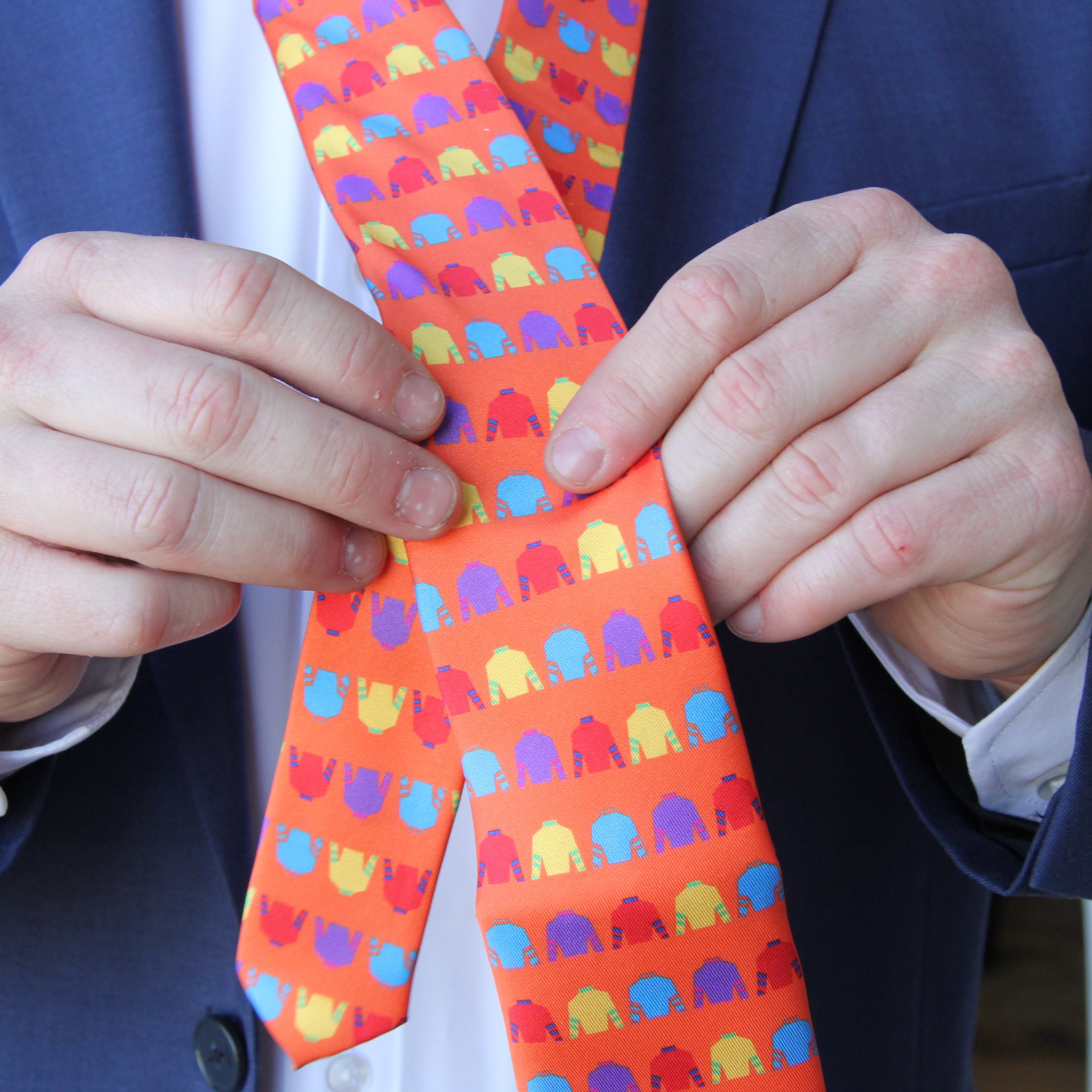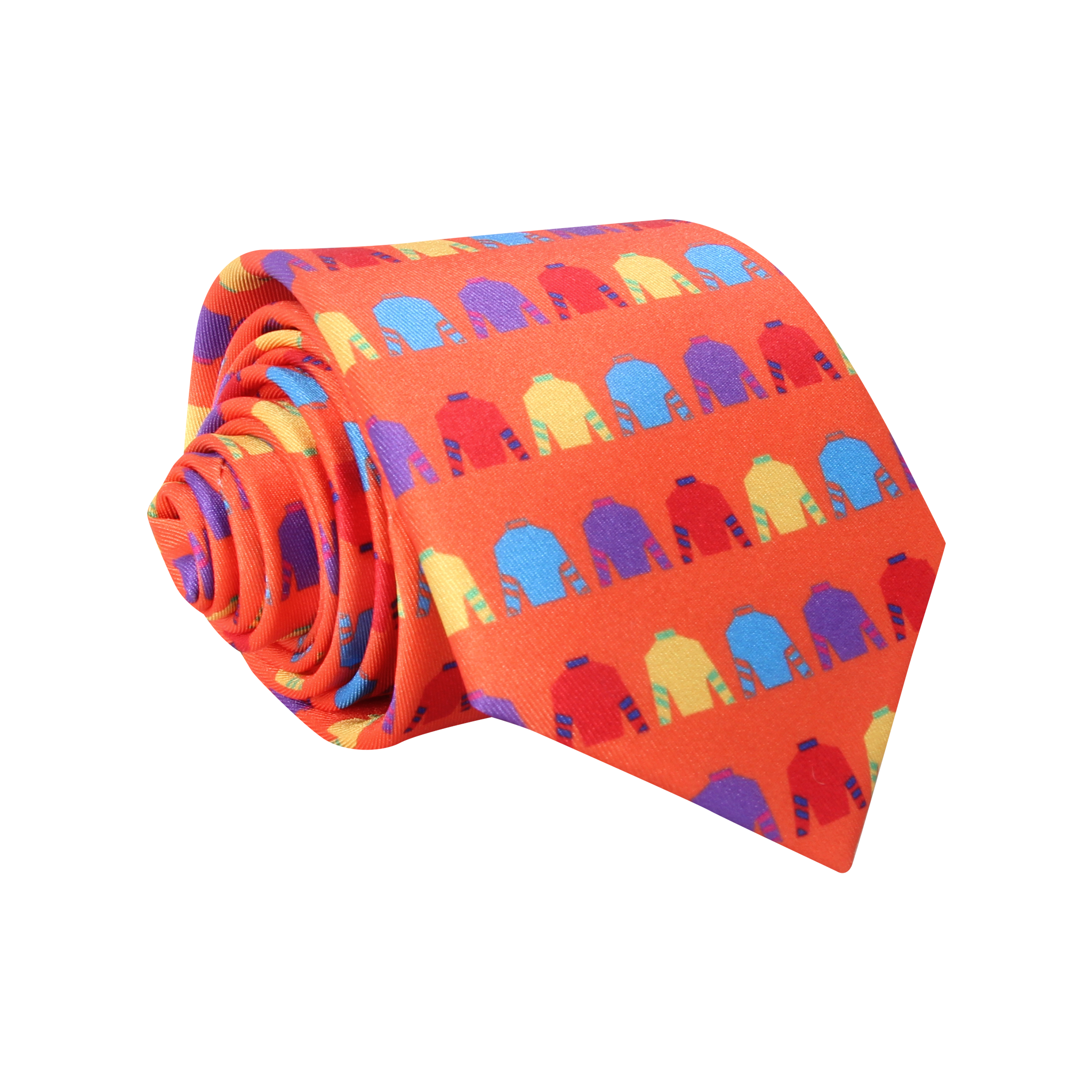 Bring the thrill of the racetrack to your wardrobe with this bold and colorful necktie featuring rows of jockey silks in vibrant shades of blue, yellow, purple, and red. Set against a lively orange background, the playful design captures the excitement and tradition of horse racing while adding a fun pop of color to your outfit. Perfect for Derby day, race meets, or any occasion where you want to stand out, this tie balances personality with classic style. Crafted from premium fabric for a smooth finish and long-lasting wear, it’s a true conversation starter for any horse racing enthusiast or fashion-forward dresser.