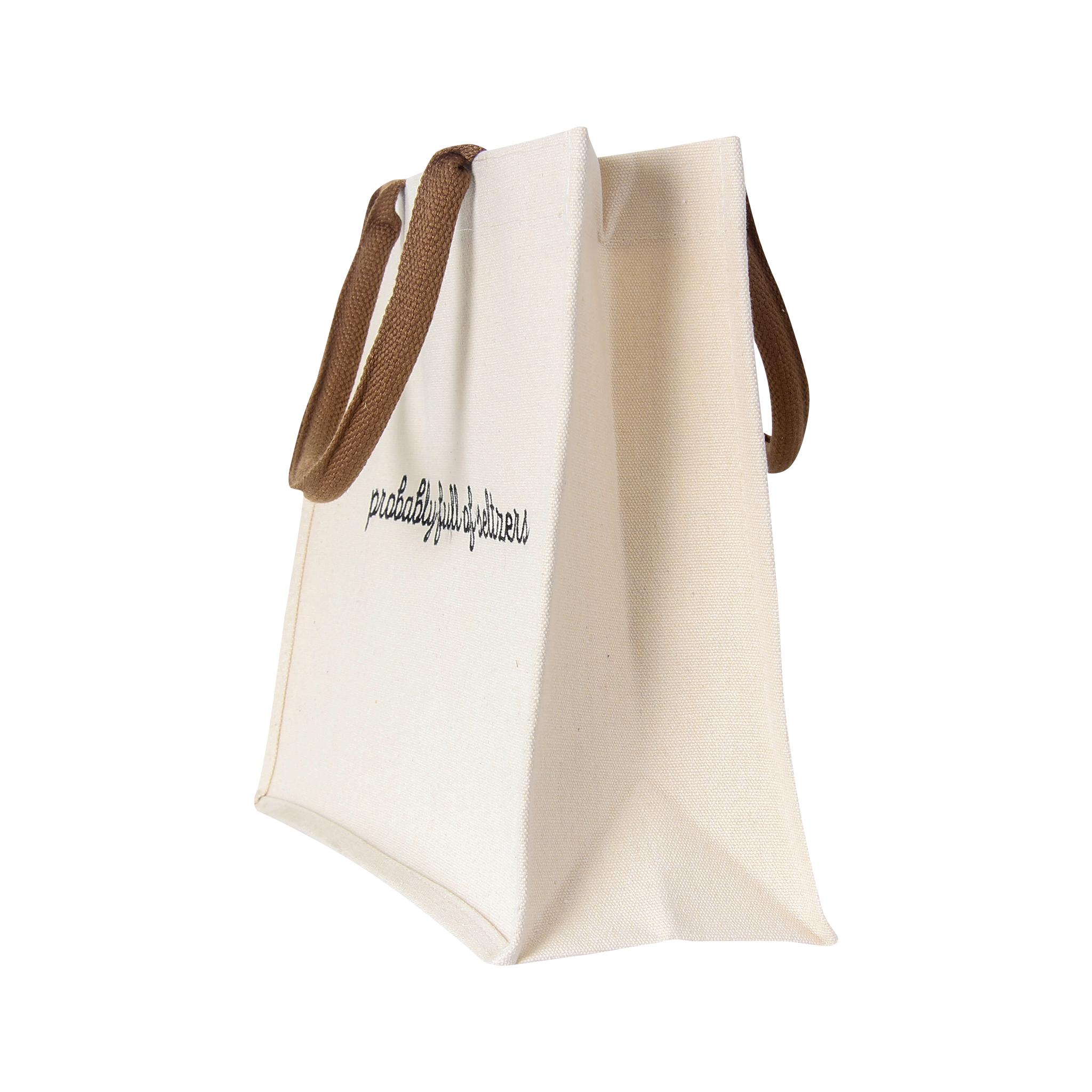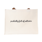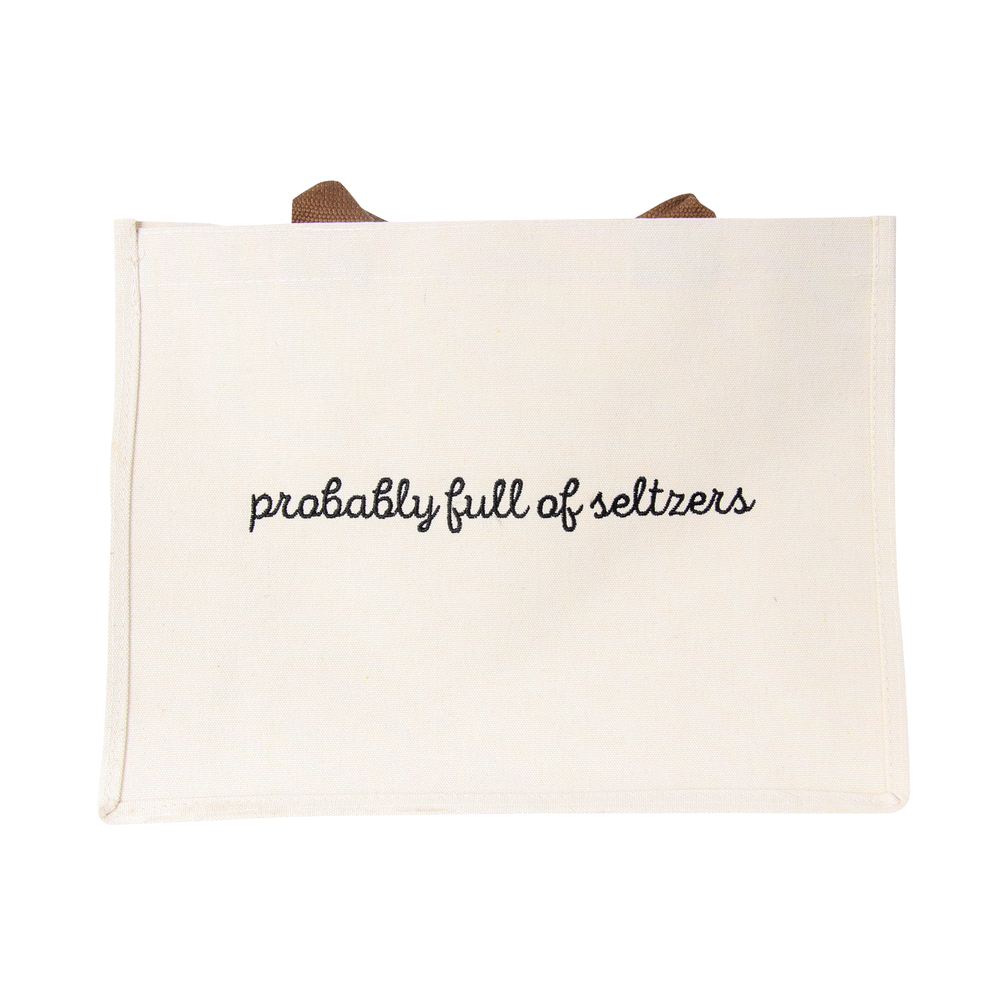 Bring a little humor to your everyday carry with this laminated canvas Probably Full of Seltzers Bag featuring the playful phrase “probably full of seltzers.” The laminated finish makes it extra durable and easy to wipe clean, while the sturdy brown handles and roomy interior ensure it’s as practical as it is fun. Whether you’re hauling groceries, packing for a beach day, or keeping your favorite bubbly on hand, this tote is built to handle it all with style and personality.