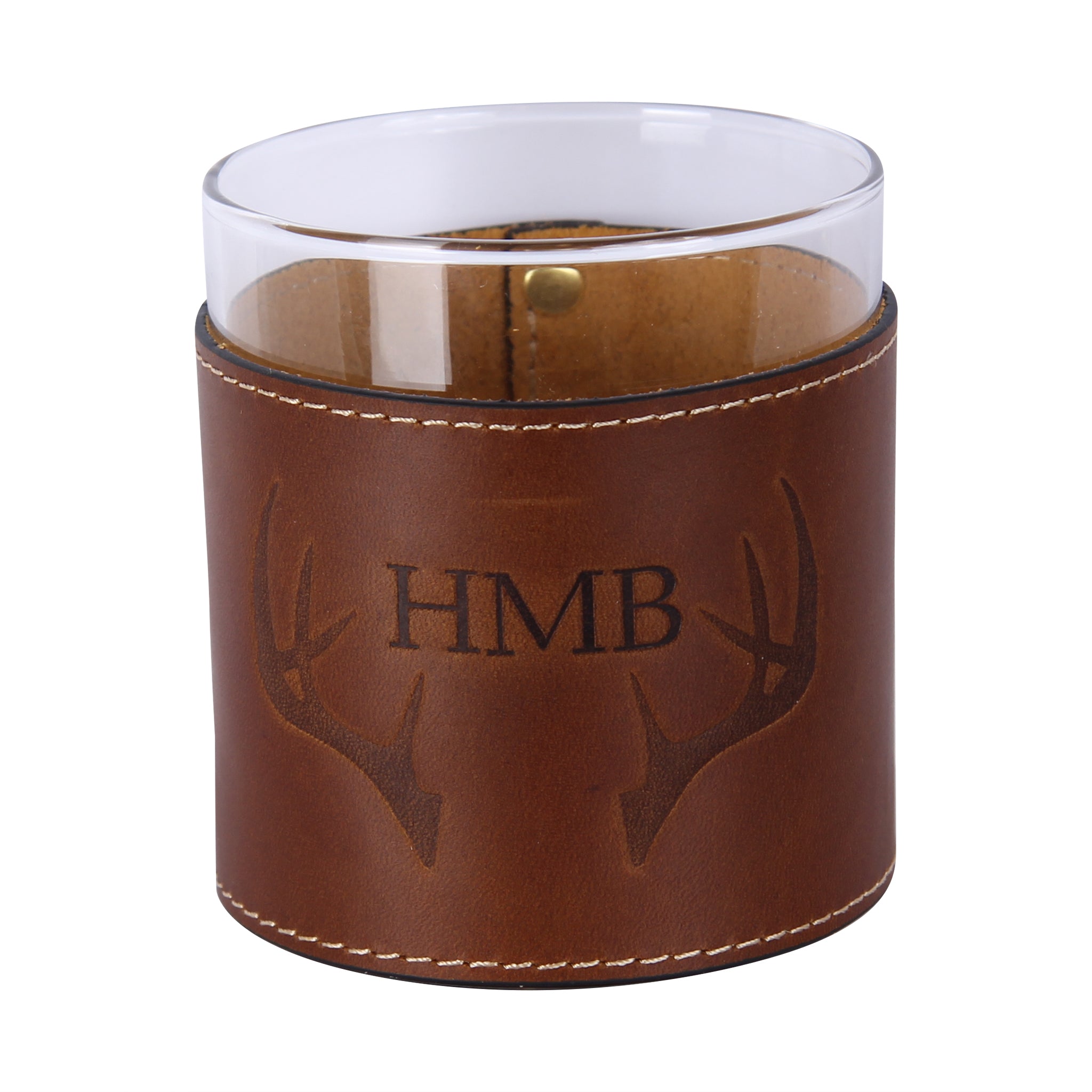Custom Set of 2 Deer Antler Leather Wrapped Bourbon Whiskey Rocks Glasses
