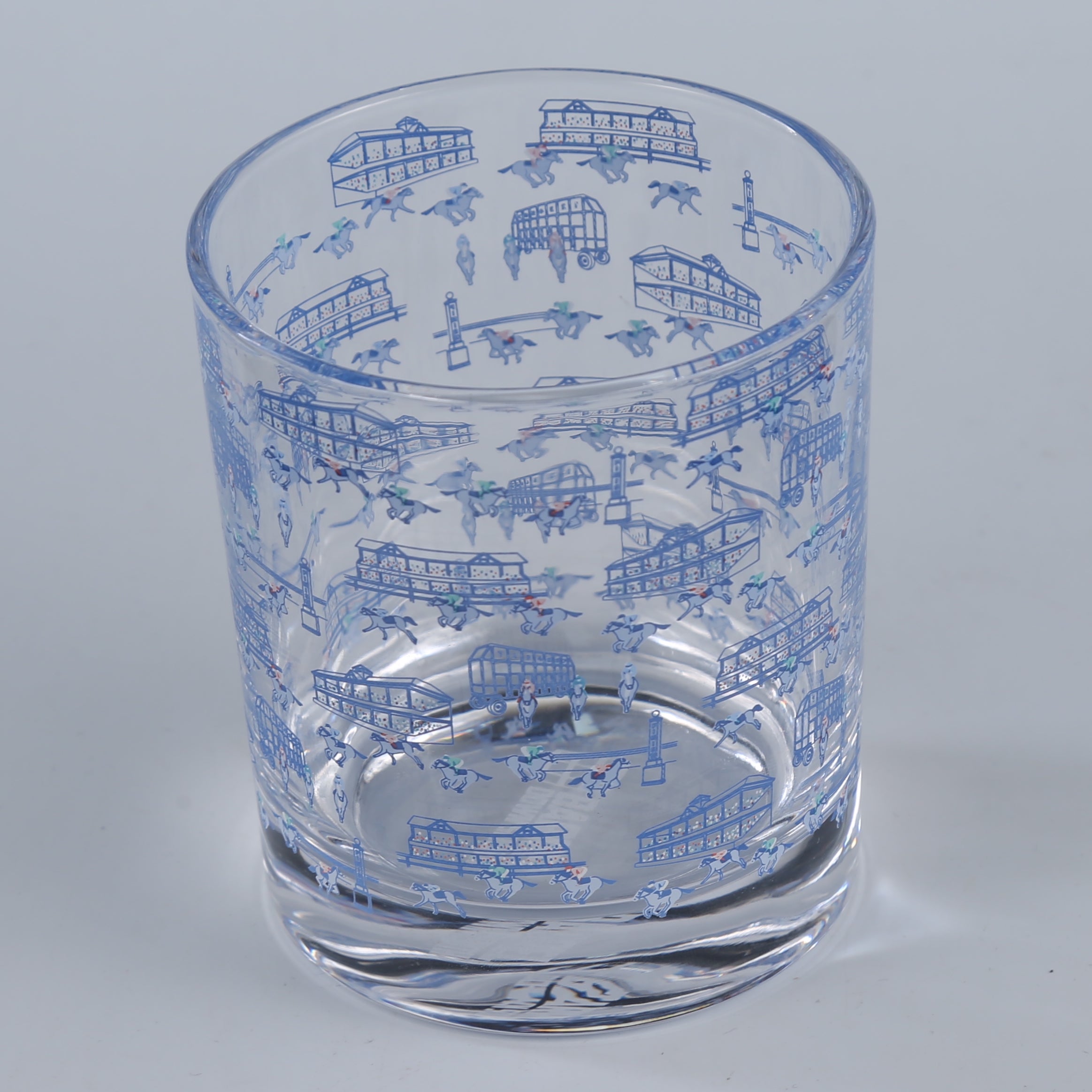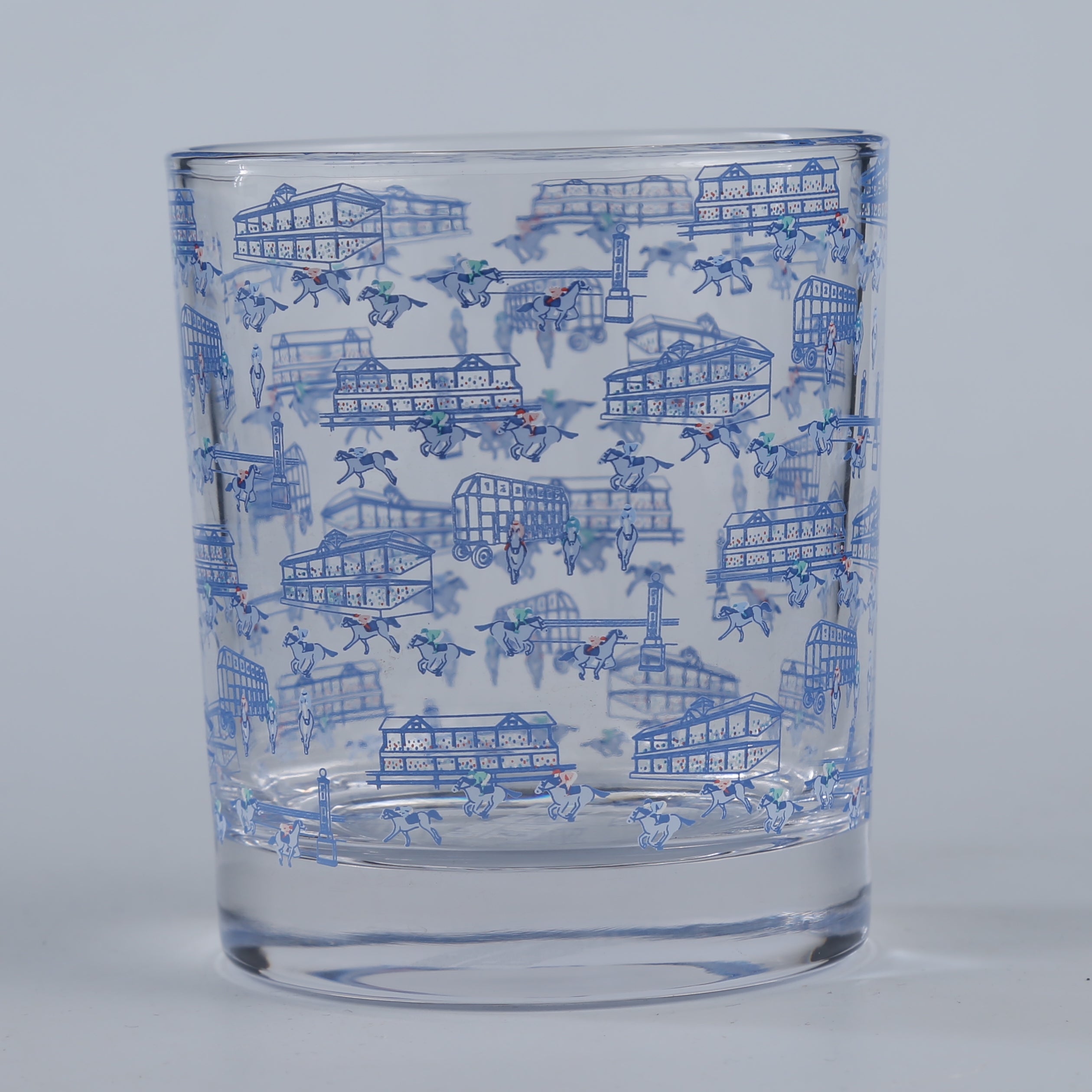 Raise a toast to the sport of kings with this Blue Horse Racing Icons Rocks Glass adorned with vibrant blue illustrations of classic horse racing imagery. Perfect for whiskey, bourbon, or your favorite spirit, this Derby-themed glass brings a dash of equestrian flair to your bar collection. Whether you're a racing enthusiast or simply love spirited style, this playful piece celebrates the tradition and excitement of the track with every sip.