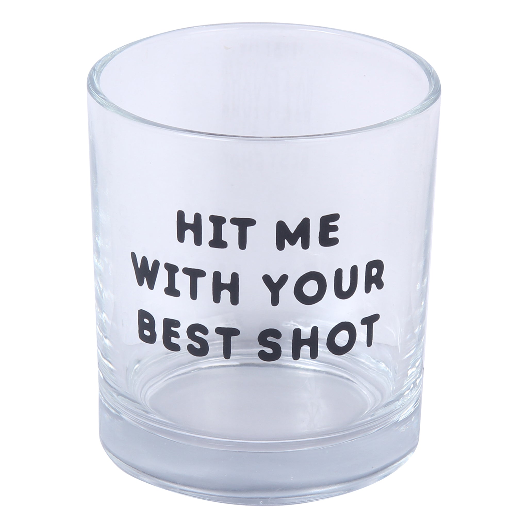 Raise the bar with the Hit Me With Your Best Shot Rocks Glass! Perfect for serving your favorite whiskey or cocktail, this sturdy glass adds a fun, bold vibe to any gathering. Its playful phrase invites good times and confident toasts, making every sip a moment to remember. Cheers to making every drink a winner!