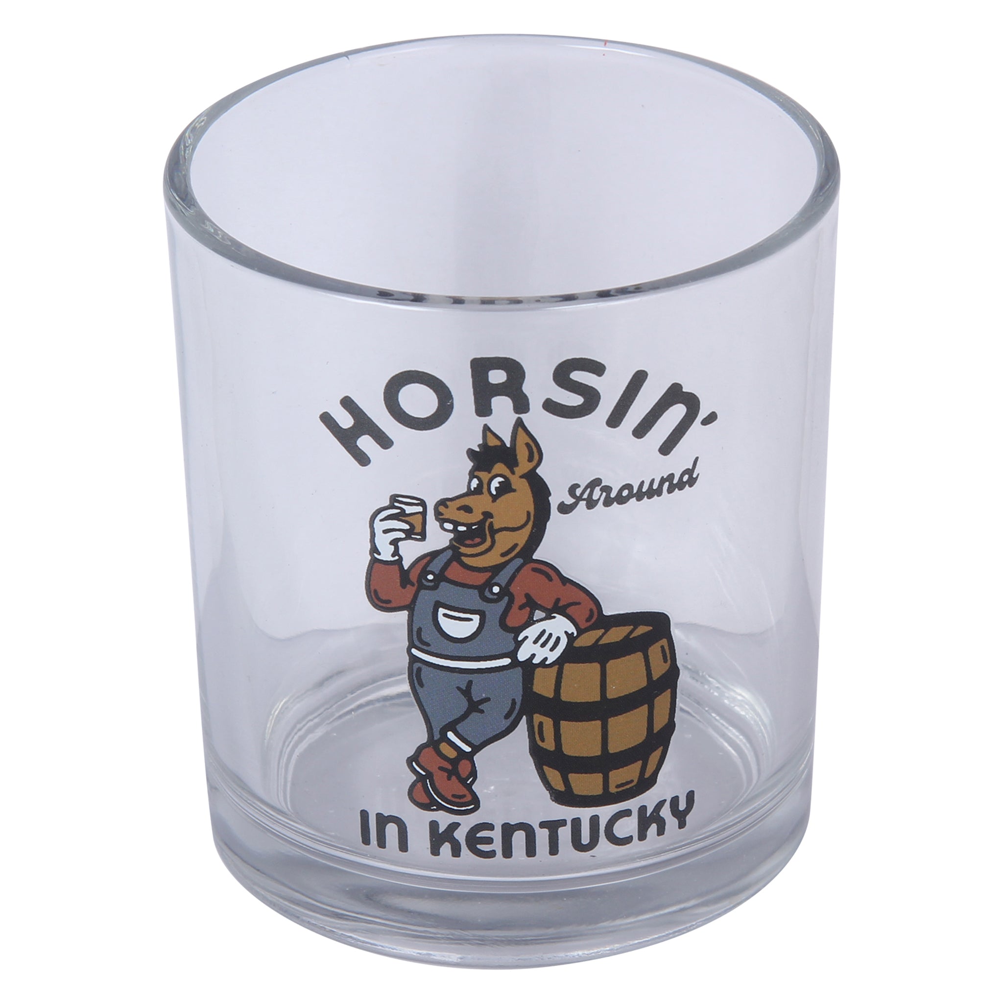 Saddle up for a spirited sip with this charming Horsin' Around In Kentucky Rocks Glass that captures the fun of Kentucky bourbon country. Featuring a playful illustration of a horse leaning against a bourbon barrel alongside the phrase "Horsin' Around in Kentucky," this glass brings a touch of Southern humor to your whiskey collection. Perfect for bourbon enthusiasts and horse lovers alike, it's an ideal gift for anyone who appreciates a good laugh with their good drink.