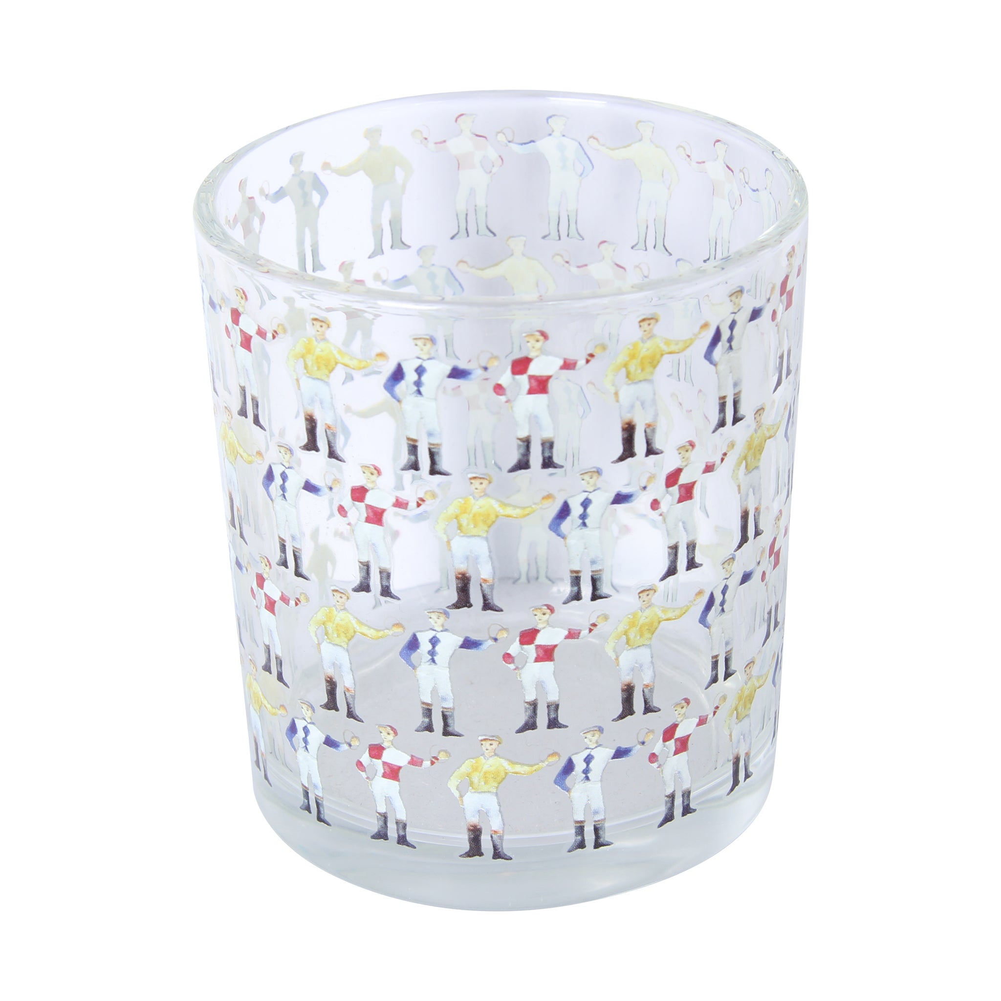 Saddle up for a spirited sip with this charming Jockeys Repeat Rocks Glass showcasing a parade of jockeys in full racing regalia. The repeating pattern wraps around the glass, bringing a touch of equestrian flair to your favorite bourbon, whiskey, or cocktail. Perfect for horse racing enthusiasts and anyone who appreciates a little whimsy with their whiskey, this glass adds personality to your barware collection while keeping drinks perfectly chilled.