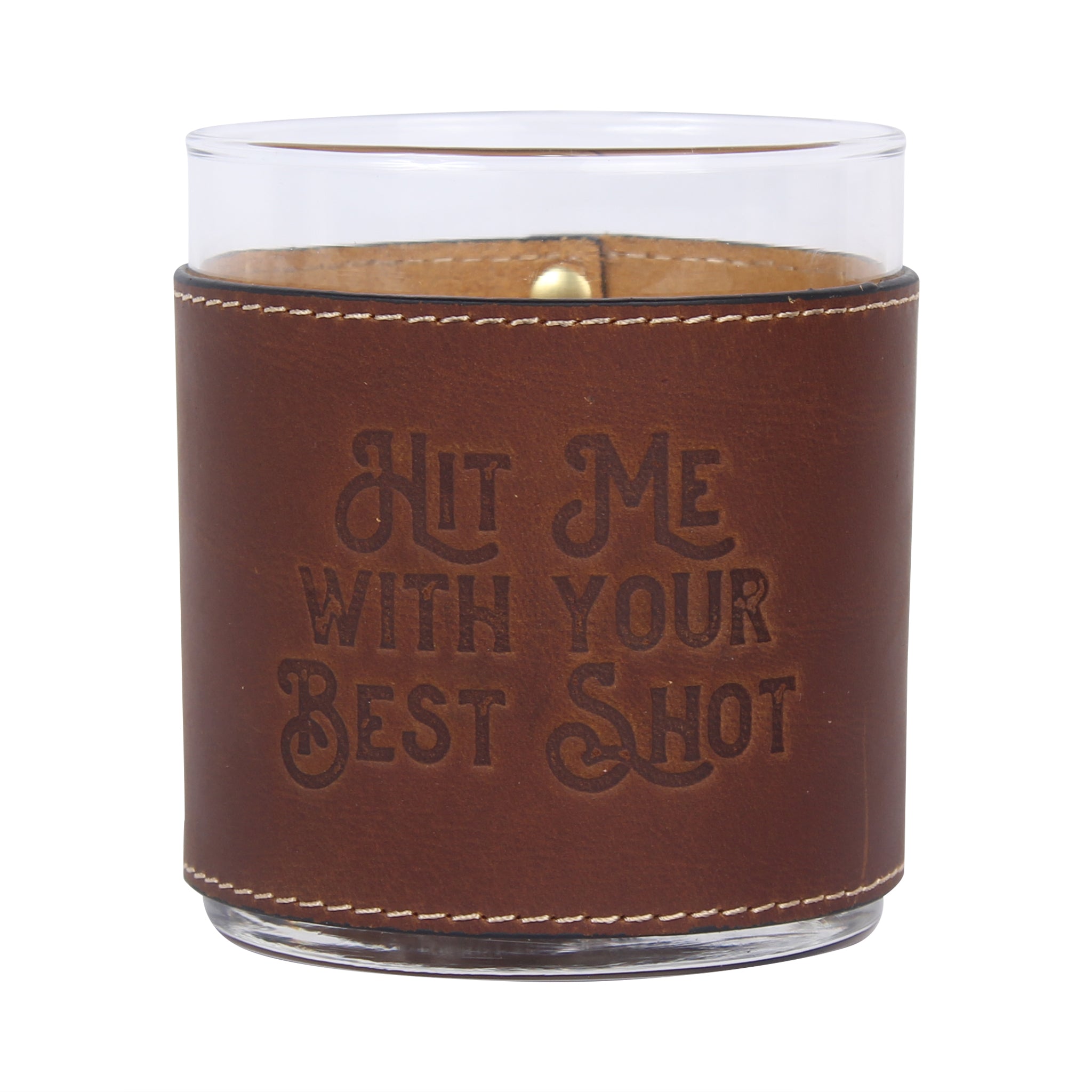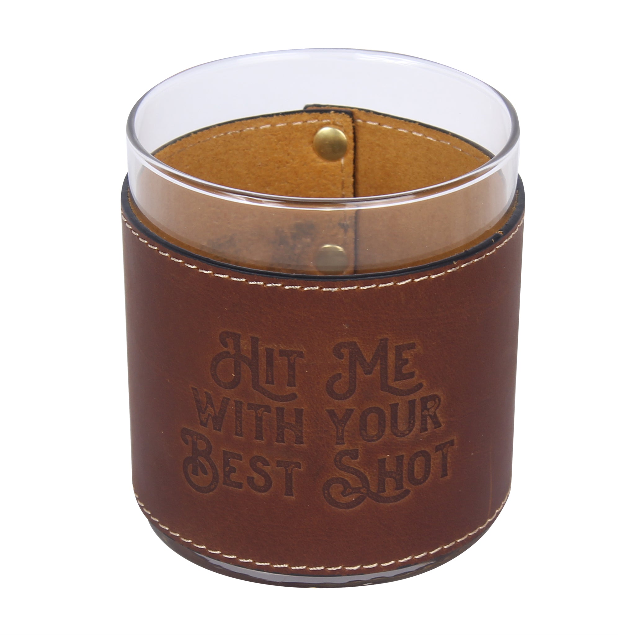 Raise a glass to bold confidence with this Hit Me With Your Best Shot Leather Rocks Glass. Featuring the cheeky phrase "Hit Me With Your Best Shot," it's the perfect companion for whiskey nights, victory celebrations, or anyone who loves a little attitude with their drink. The supple leather grip keeps your hand comfortable while adding rugged sophistication to your bar setup. Whether you're toasting to life's wins or just enjoying a smooth pour, this glass delivers style and personality in every sip.