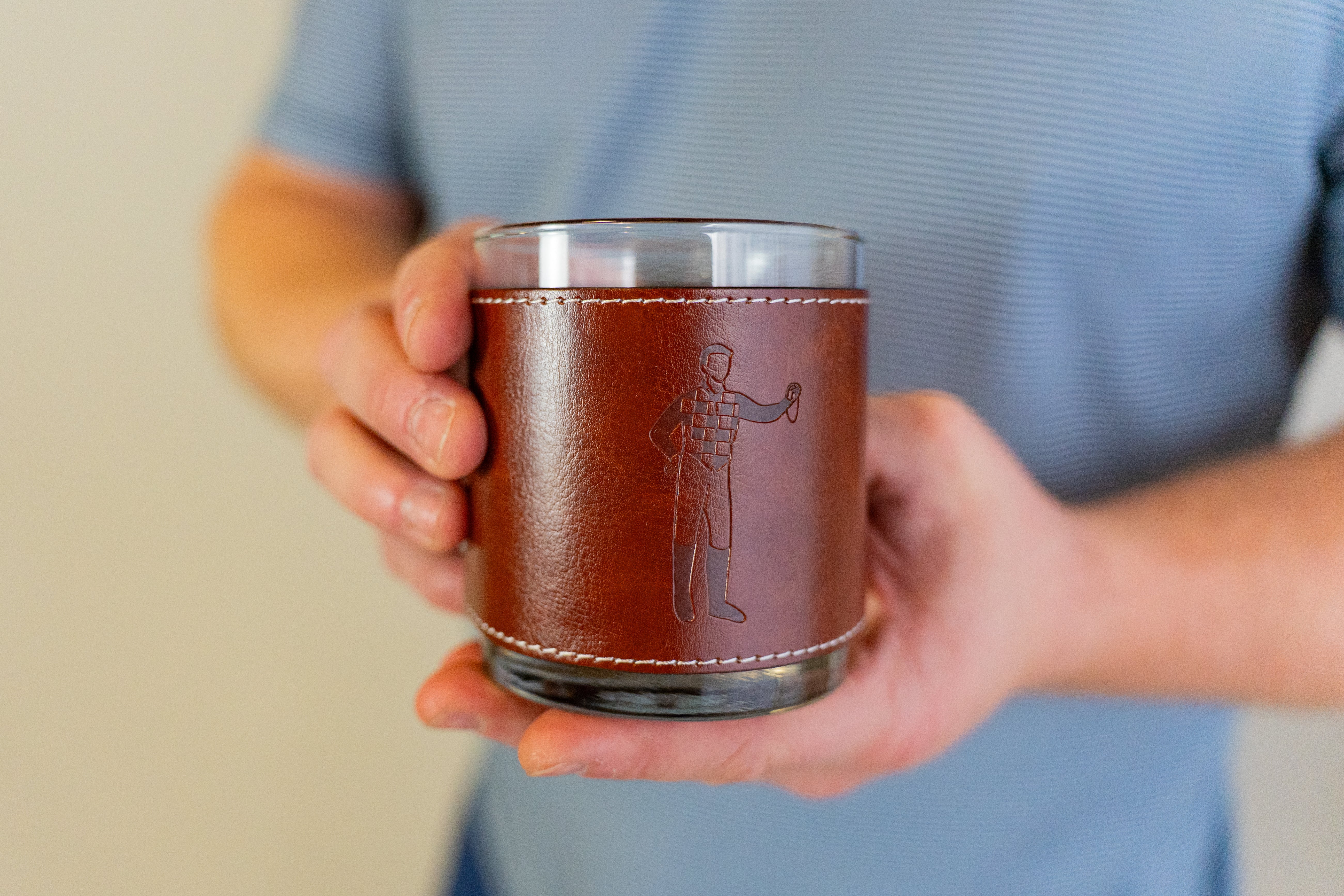 Elevate your drink experience with our Standing Jockey Faux Leather Rocks Glass. Made with faux leather and designed in the classic double old fashioned style, this glass brings a touch of luxury to your bourbon or whiskey. With its sturdy design, it's perfect for both casual and formal occasions.