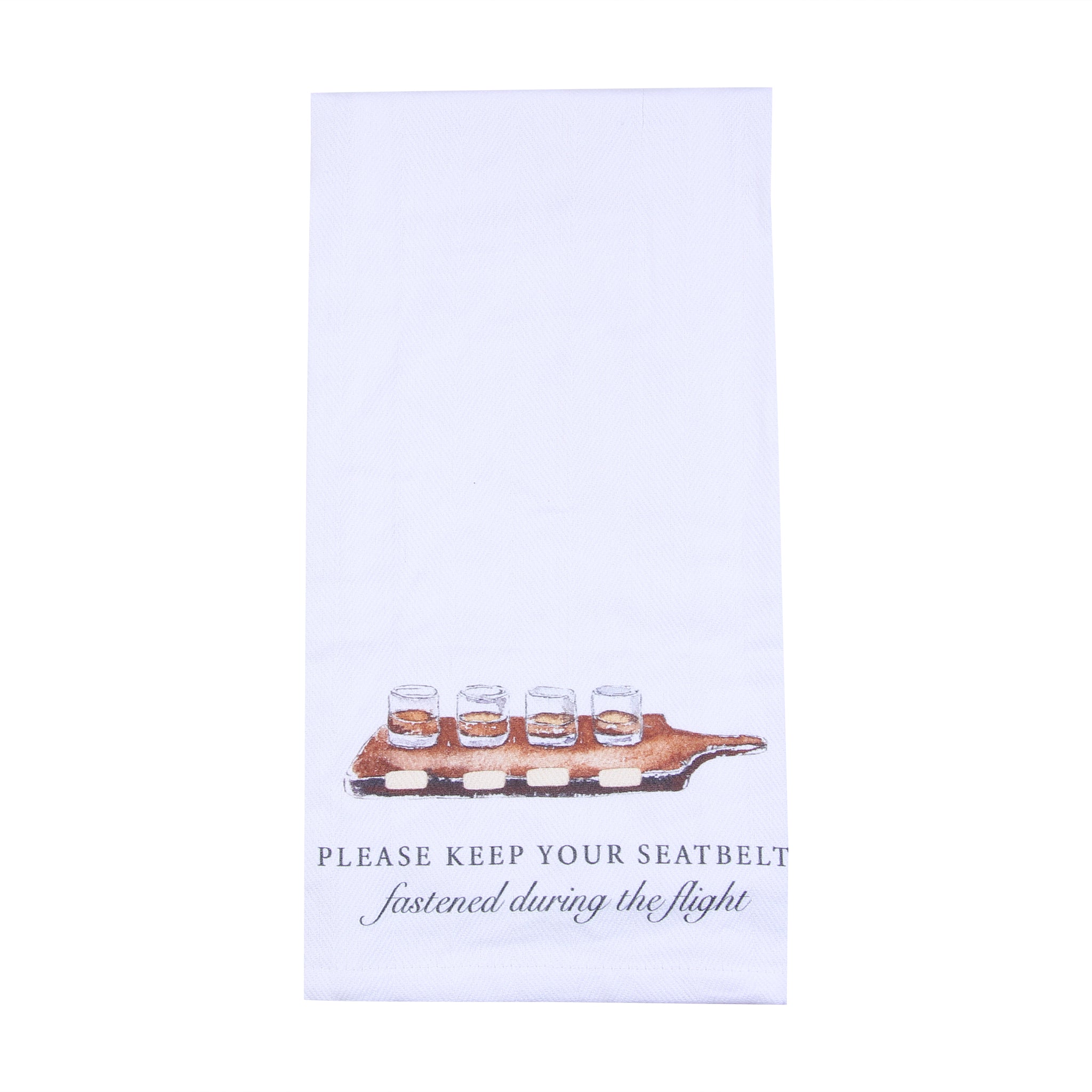 Take your love for bourbon to new heights with our witty Please Keep Your Seatbelt Fastened Tea Towel. Featuring a charming illustration of a bourbon flight and a playful nod to travel safety, this towel is perfect for whiskey enthusiasts and fans of clever decor. Made from 100% premium cotton, it’s not only stylish but also highly functional for your kitchen, bar, or entertaining needs. Whether you're hosting a bourbon tasting, decorating your home bar, or searching for a unique gift for a bourbon lover, this towel adds personality and practicality to any setting. A must-have for whiskey aficionados who appreciate a little humor with their spirits!