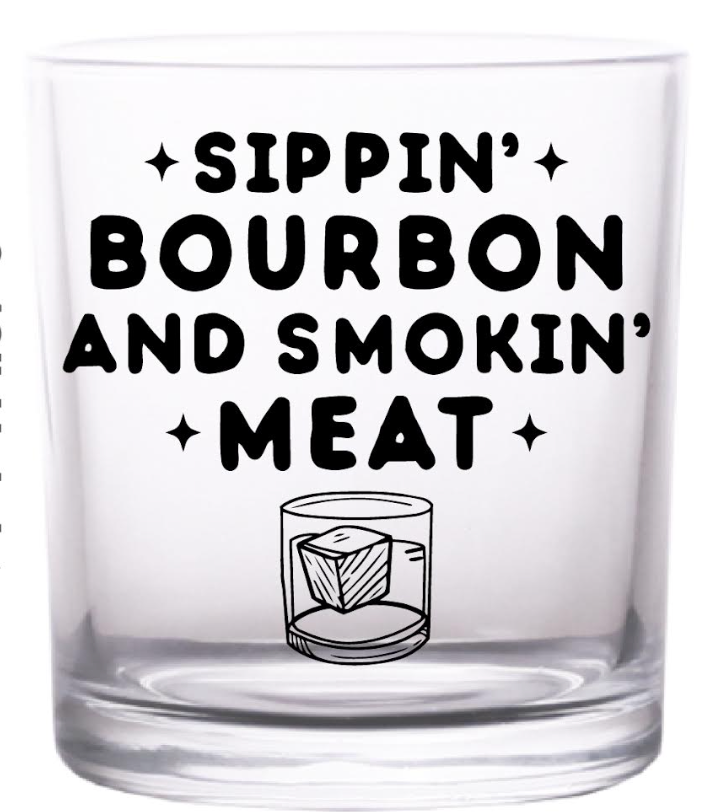 Celebrate backyard traditions and bold flavor with the Sippin’ Bourbon and Smokin’ Meat Rocks Glass. Featuring playful, bold typography and a simple whiskey-on-the-rocks illustration, this glass is made for those who appreciate slow-smoked meat, good bourbon, and easygoing gatherings. It’s the perfect blend of humor and classic barware style.