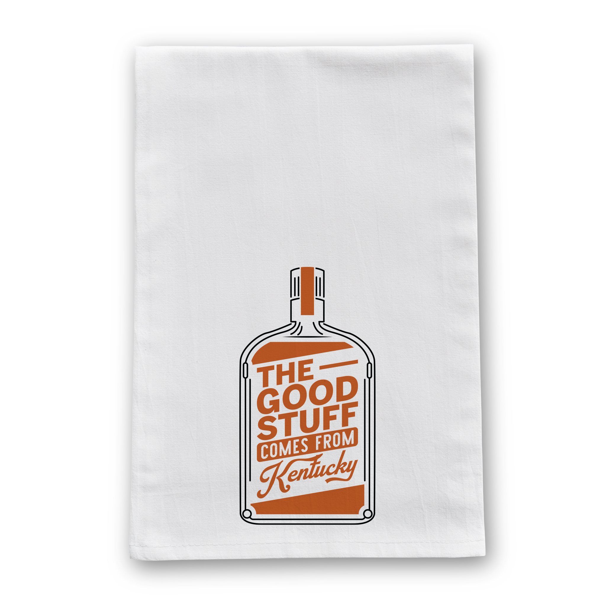Wipe down your kitchen in style with this charming The Good Stuff Comes From KY Tea Towel featuring a bold bourbon bottle illustration and the cheeky reminder that "The good stuff comes from Kentucky." Perfect for bourbon enthusiasts and Southern charm lovers alike, this playful kitchen essential doubles as a conversation starter. Soft, absorbent, and ready to add a splash of personality to your culinary space.