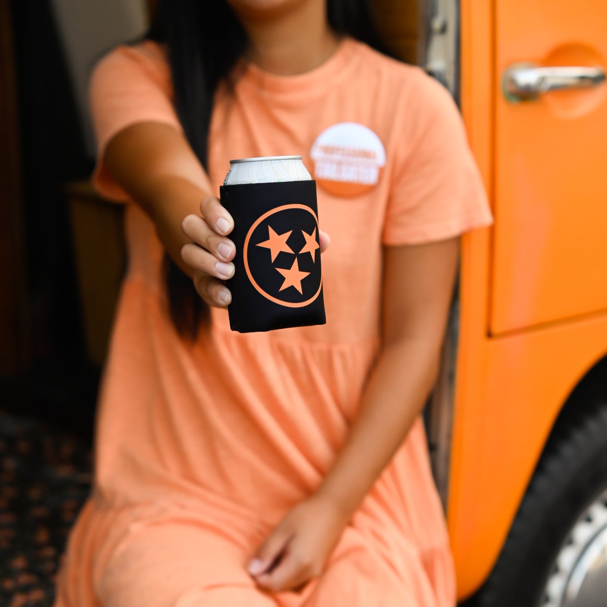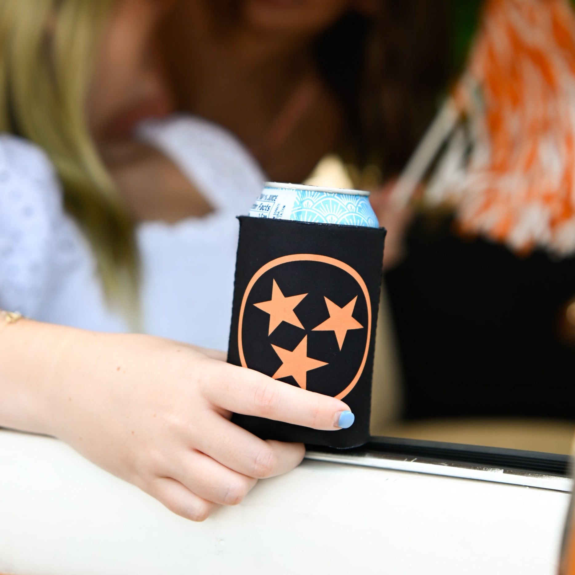 Keep your drinks cool and your style cooler with the Black/Orange Tri Star Can Cooler. Its vibrant black and orange design adds a fun pop of color while insulating your beverage to stay refreshingly chilled. Perfect for parties, tailgates, or just relaxing outdoors, this can cooler combines practicality with playful flair.