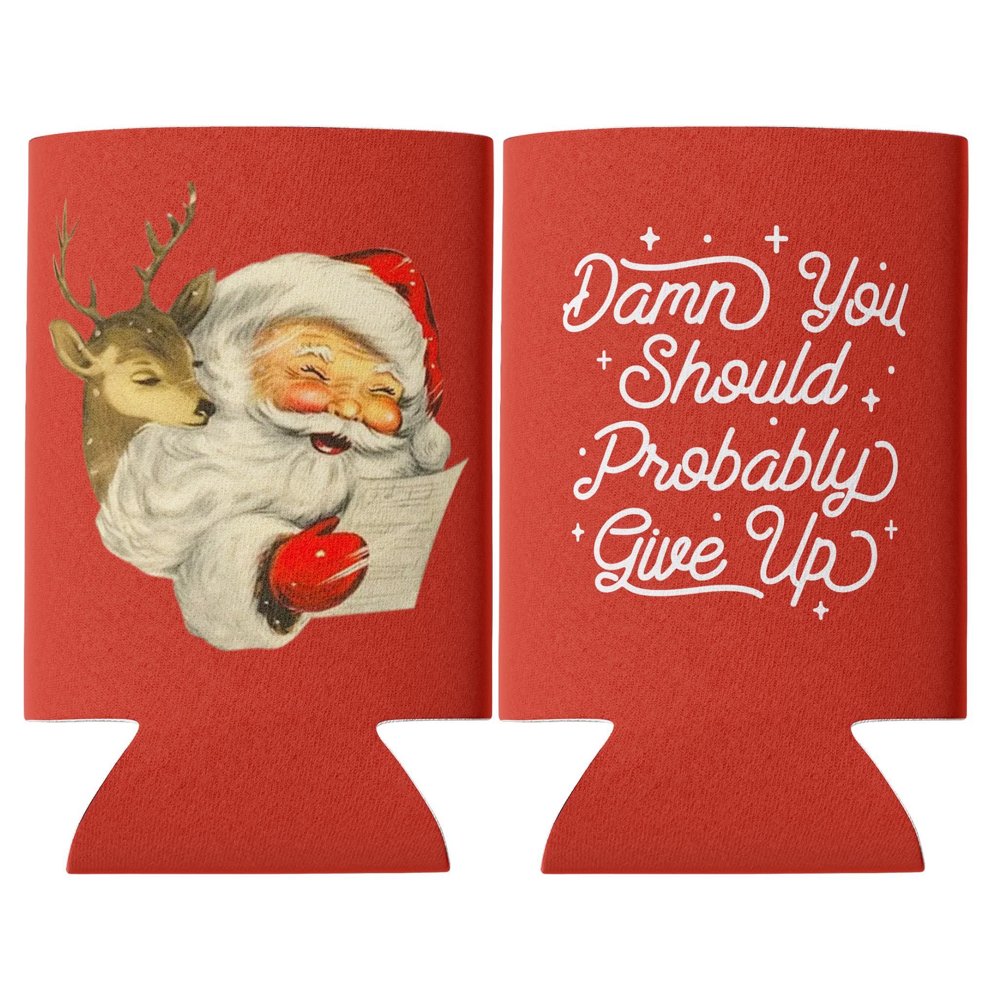 Keep your drink cool and your holiday spirit cheeky with the Give Up Christmas Can Cooler. Featuring the playful message "damn you should probably give up," this can cooler adds a fun twist to your festive gatherings while keeping your beverage perfectly chilled. Perfect for those who enjoy a little holiday humor with their drinks.