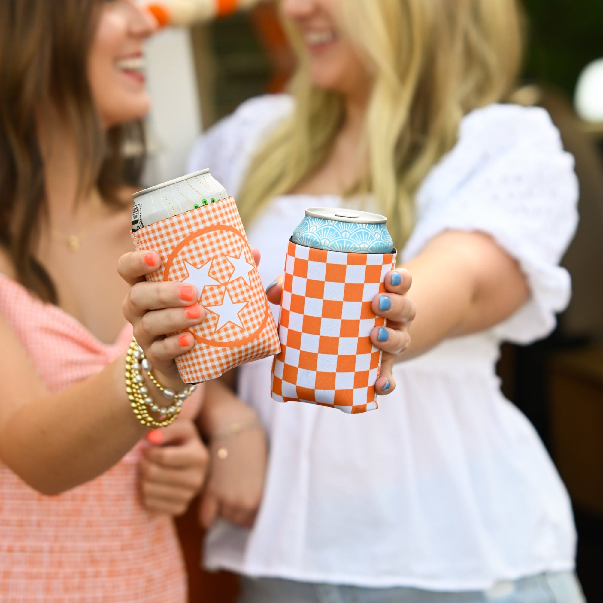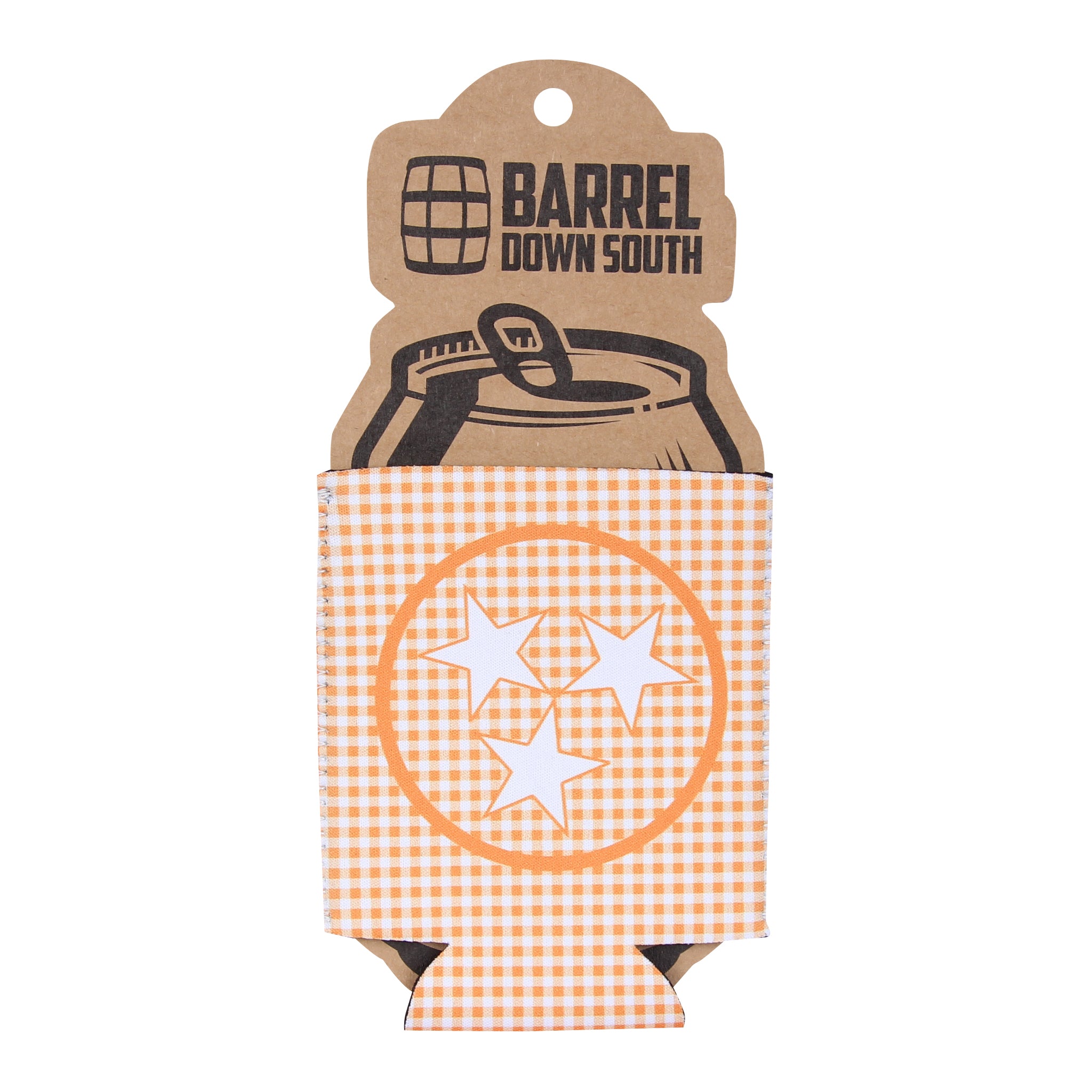 Keep your drinks cool and your style cooler with the Gingham Tri Star Can Cooler. Its fun gingham pattern and star design add a playful twist to any gathering, while the insulated material keeps your beverage perfectly chilled. Whether you're tailgating, picnicking, or just relaxing, this can cooler is the perfect companion for a refreshing sip every time.