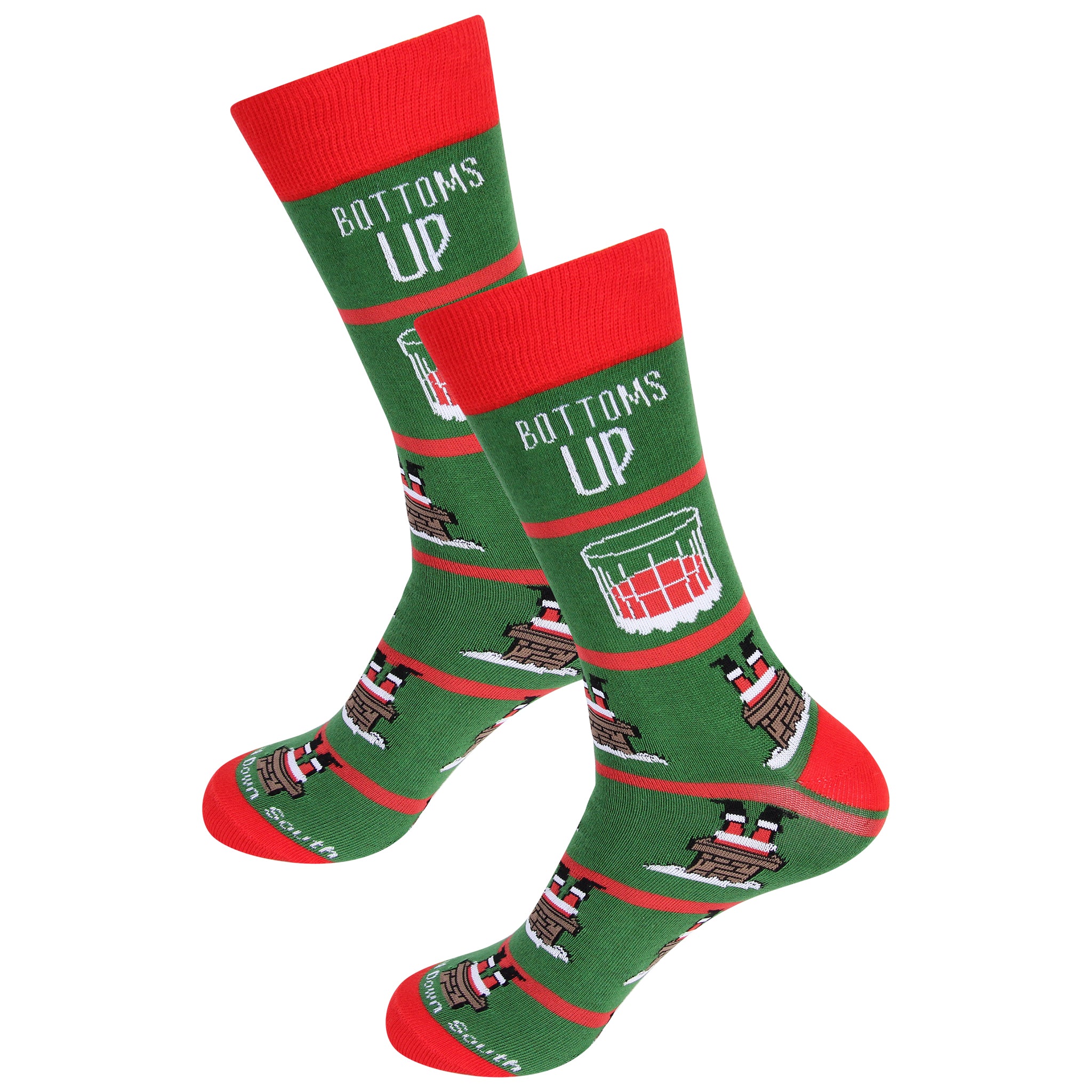 Add some holiday humor and cheer to your wardrobe with our Bottoms Up Bourbon Christmas Socks, featuring a playful repeating pattern of Santas stuck upside down in chimneys, accompanied by whiskey glasses and the cheeky phrase “Bottoms Up.” These festive novelty socks are perfect for Christmas parties, holiday gatherings, or gifting to friends who appreciate a fun twist on classic seasonal themes.