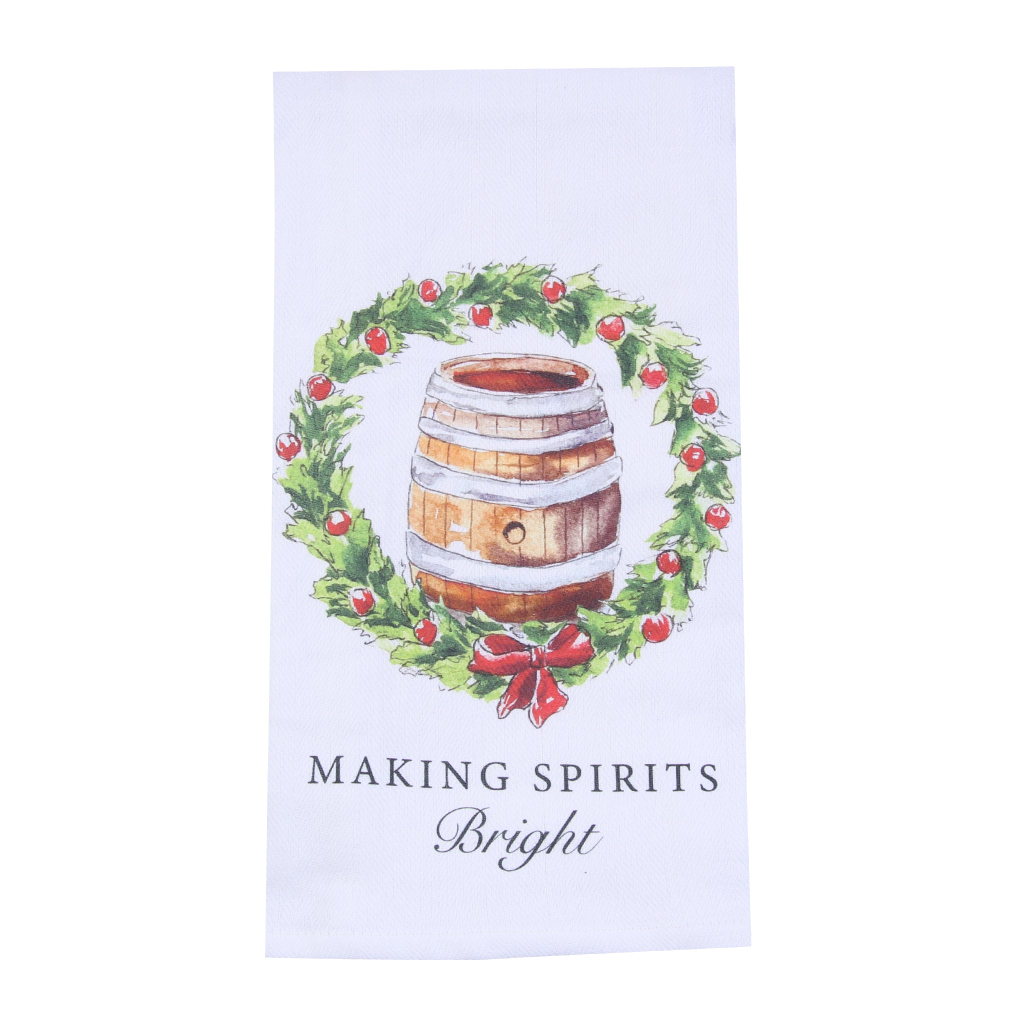 Spread holiday cheer with a bourbon twist using this clever tea towel featuring a bourbon barrel nestled inside a festive wreath paired with the witty text "making spirits bright." Perfect for whiskey lovers and those who appreciate holiday humor, this playful design cleverly blends seasonal tradition with a love of fine spirits. The quality fabric makes it both functional and fun for your kitchen during the holidays and beyond. A spirited way to celebrate the season with style and a smile!