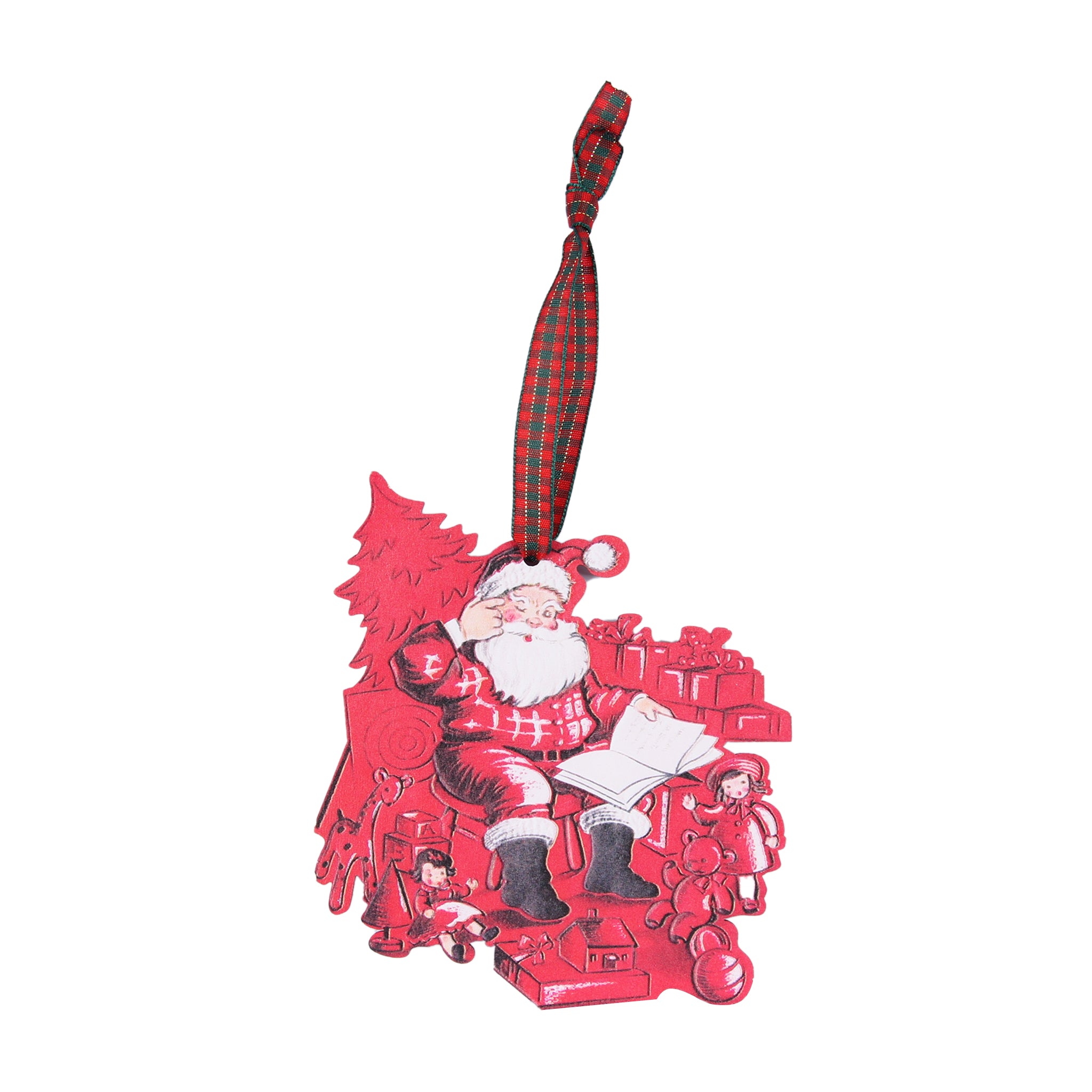 Santa’s cozy red chair, overflowing presents, and focused expression as he reviews who’s been naughty or nice make this piece a nostalgic favorite. This handcrafted-style Christmas ornament is perfect for adding warmth and timeless charm to any holiday setup.
