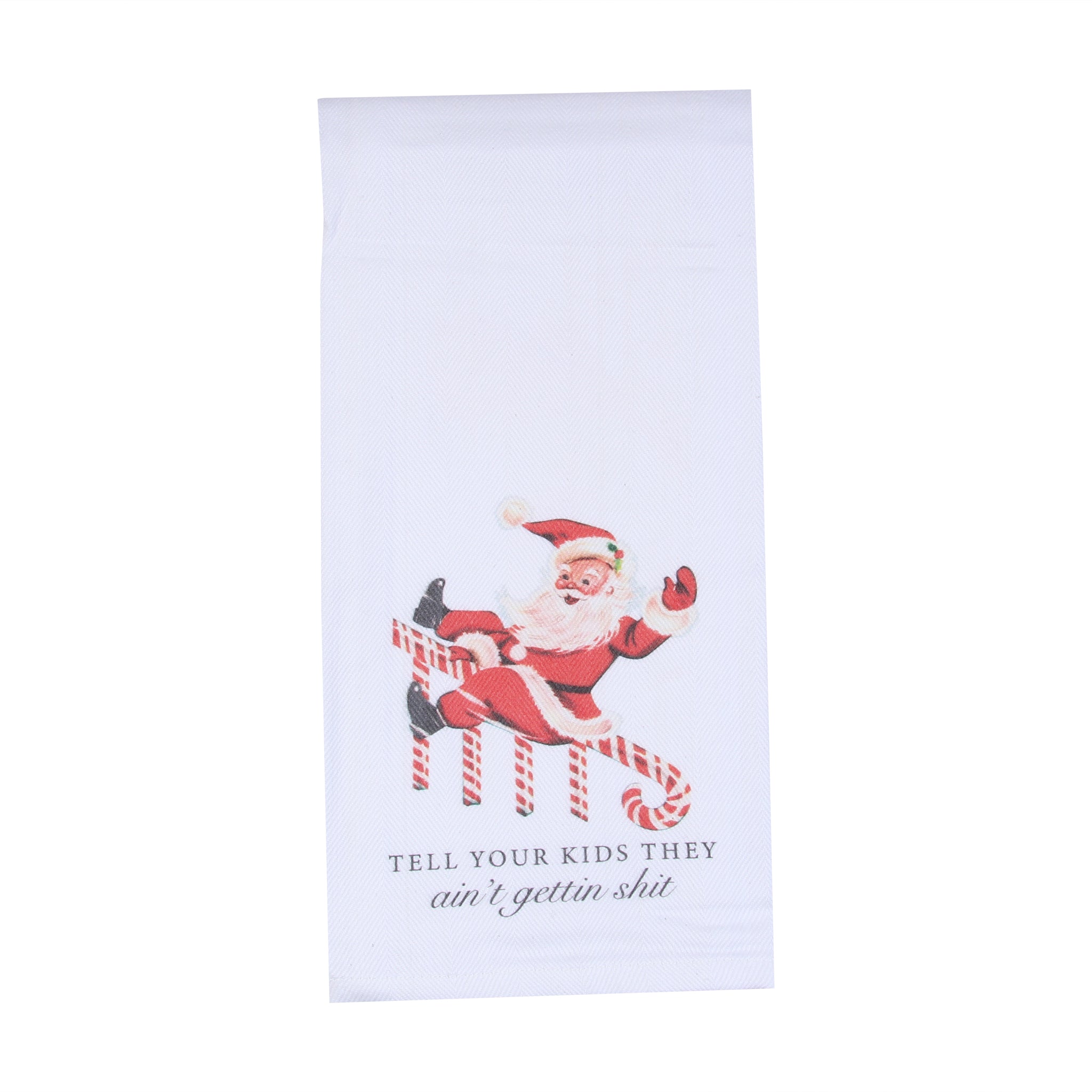 Add a hilarious and bold twist to your holiday kitchen with the Tell Your Kids Tea Towel. Featuring a cheeky illustration of Santa alongside playful text, this towel brings a fun, irreverent vibe to your festive décor.