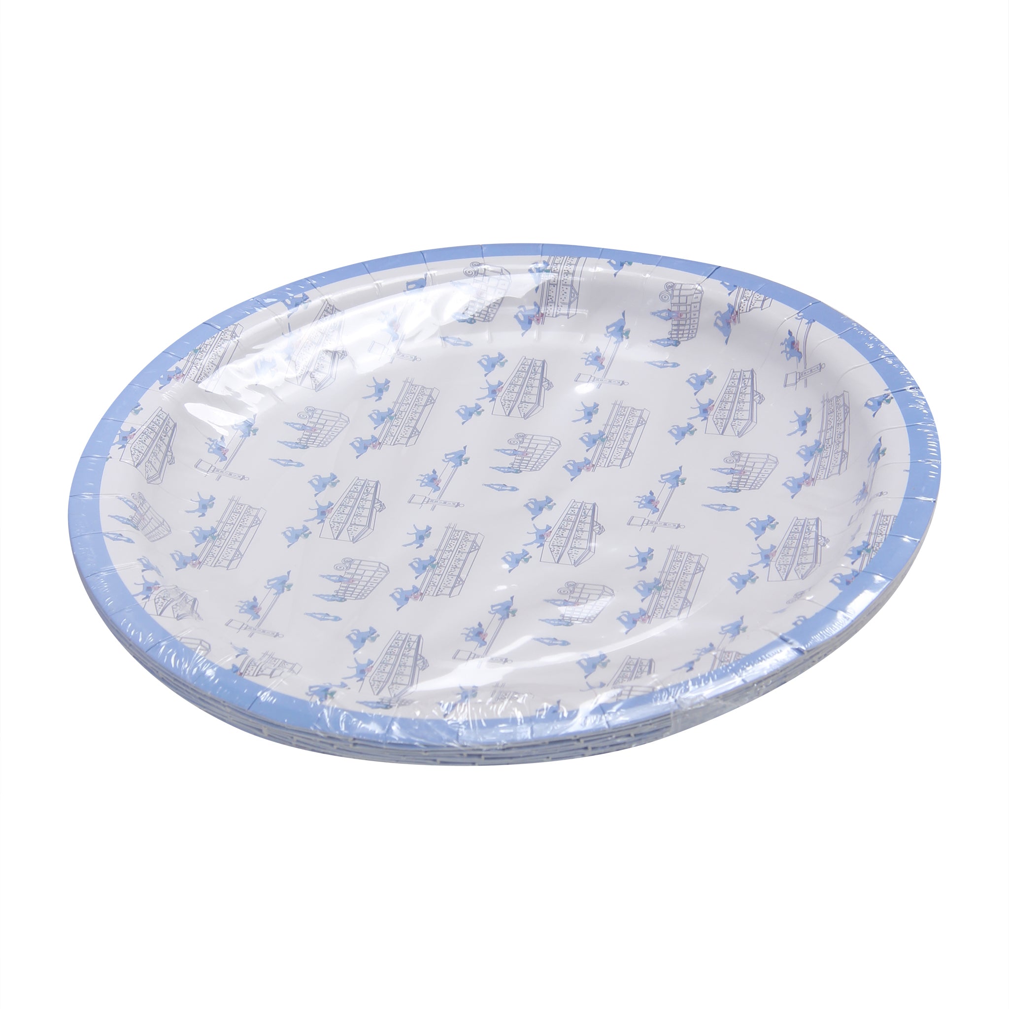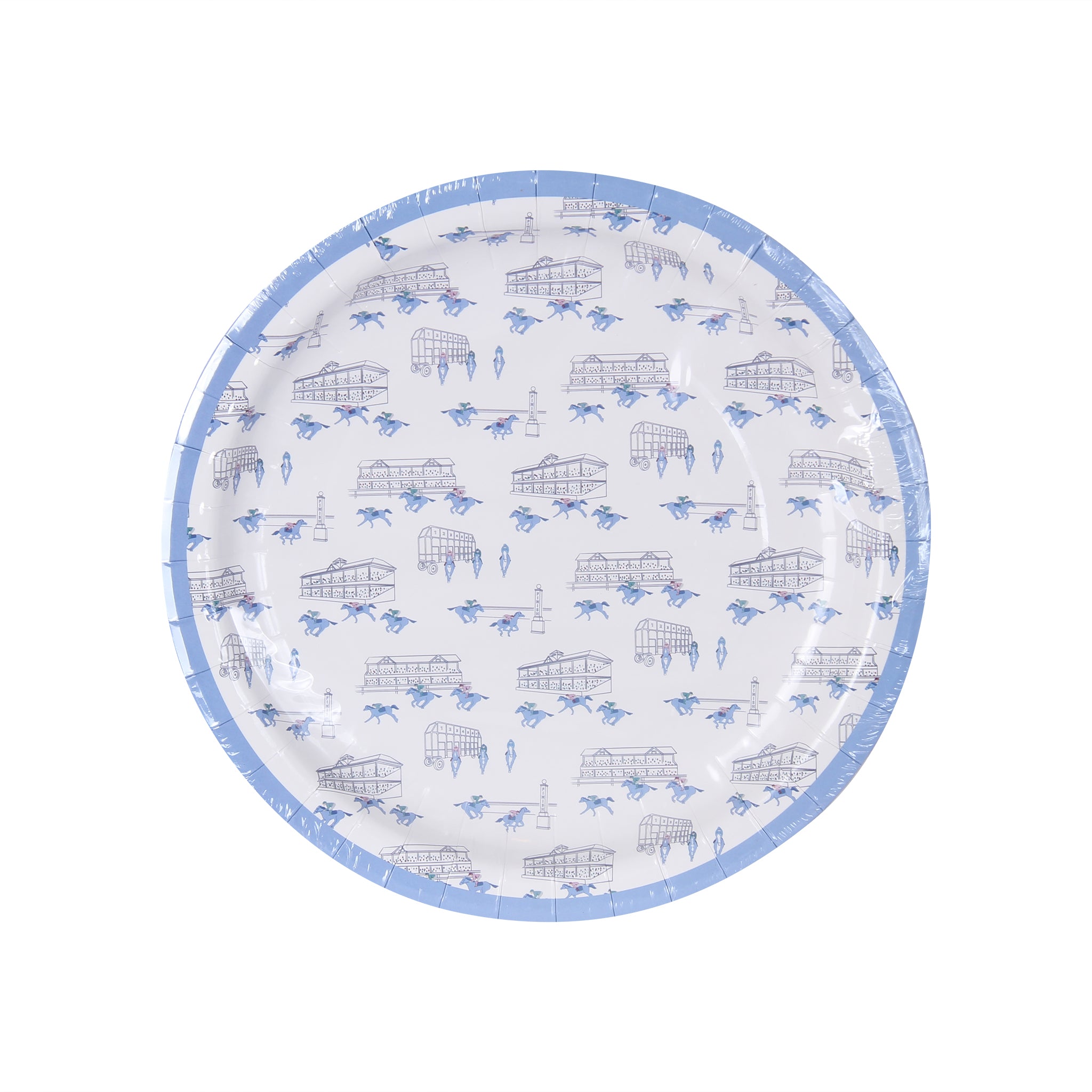 Bring the excitement of the track to your table with our Blue Horses Racing Paper Plates. Featuring detailed blue illustrations of racing horses, grandstands, starting gates, and classic track scenes, this design captures the energy and tradition of race day.
