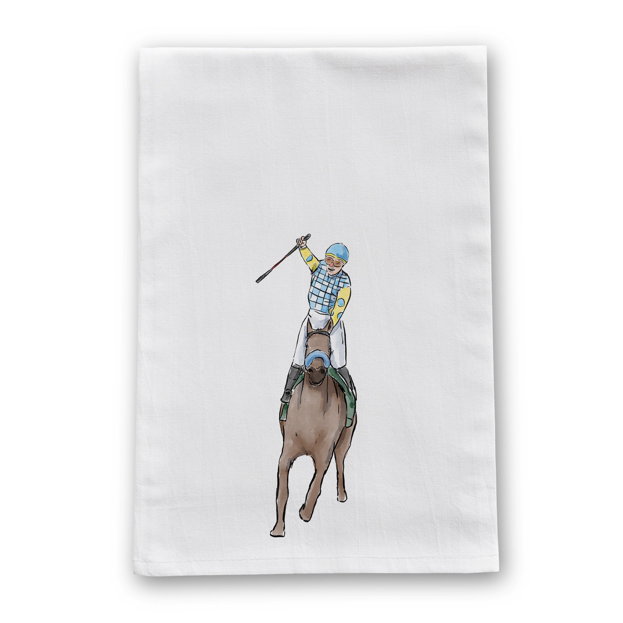 Celebrate the thrill of the turf with our Cheering Jockey Hand in Air Tea Towel, a must-have for horse racing fans and equestrian art lovers alike. This premium-quality 100% cotton tea towel features a dynamic illustration of a jockey on horseback, captured in the heat of competition—fist triumphantly raised as he surges toward the finish line.
