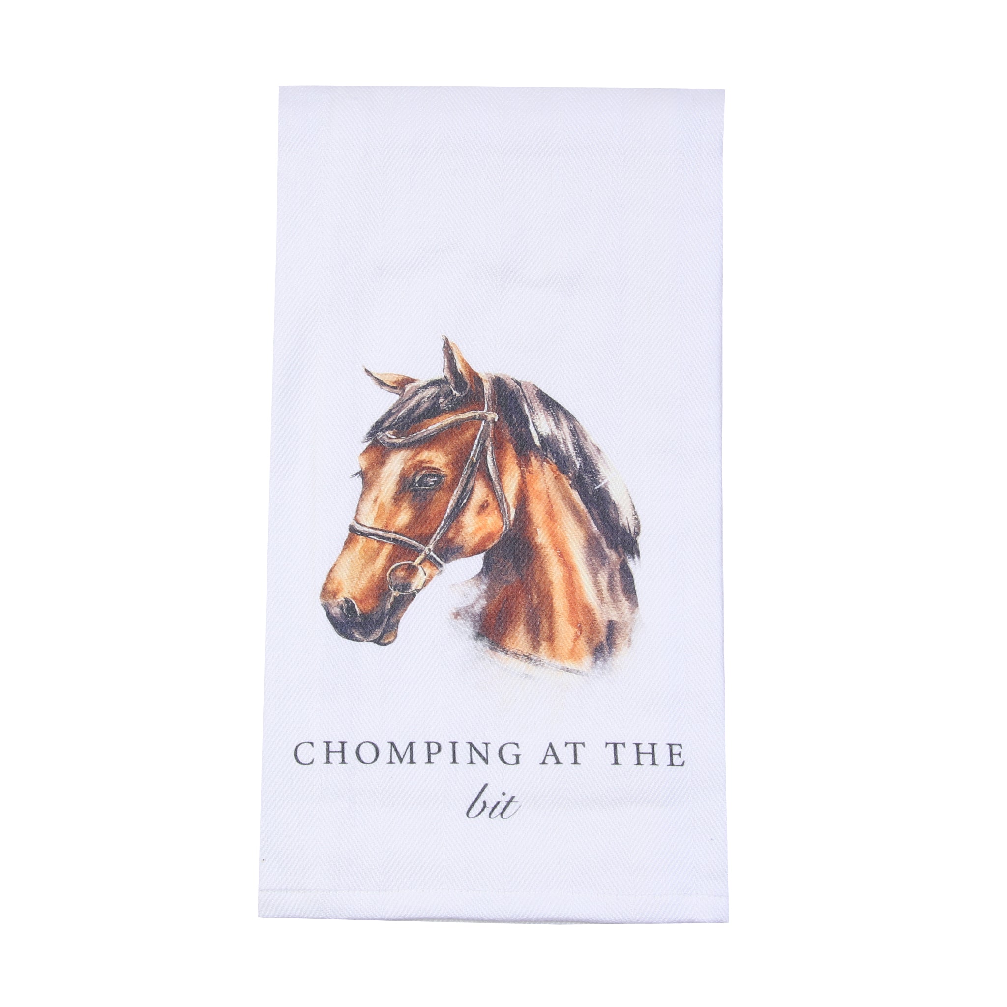 Saddle up your kitchen with this charming Chomping At The Bit Tea Towel featuring a spirited horse illustration and the witty phrase "Chomping at the Bit." Perfect for horse lovers and equestrian enthusiasts, this playful design brings a touch of Southern charm and humor to your everyday kitchen routine. Whether you're drying dishes or adding a decorative accent to your countertop, this towel combines practicality with personality. A delightful gift for anyone who appreciates a good pun and loves all things horses.