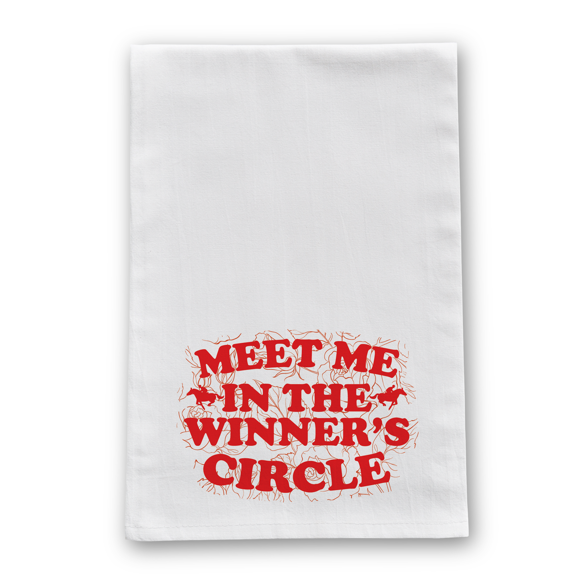 Celebrate victory in style with this elegant tea towel featuring the romantic phrase "Meet me in the winner's circle" set against a beautiful rose-pattern background. Perfect for horse racing fans with a touch of sophistication, this playful design combines the thrill of the track with timeless floral charm. The quality fabric is practical for everyday kitchen use while the lovely illustration adds a dash of elegance to your home. An ideal choice for anyone who dreams of champagne toasts and triumphant moments!
