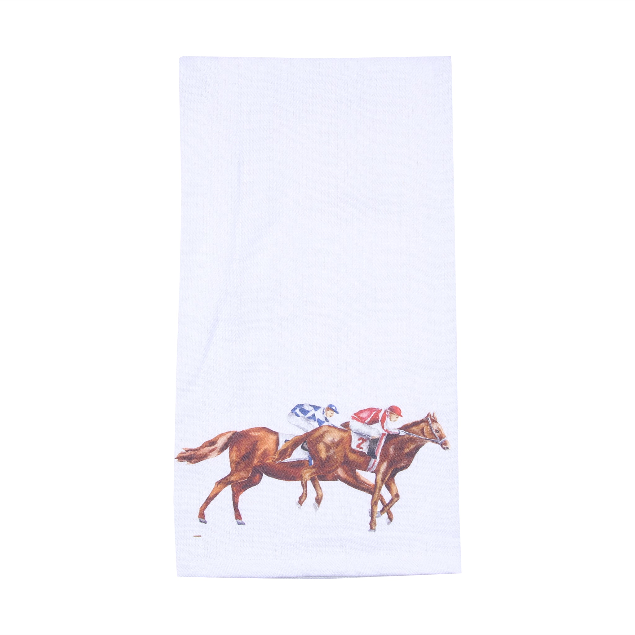 Add a dash of excitement to your kitchen with this Neck and Neck Horses Racing Derby Tea Towel. Featuring two spirited horses neck and neck in a thrilling race, this playful design brings the spirit of the derby right to your countertop. Perfect for drying dishes or brightening up your space, it's a fun and functional way to celebrate your love for horse racing.