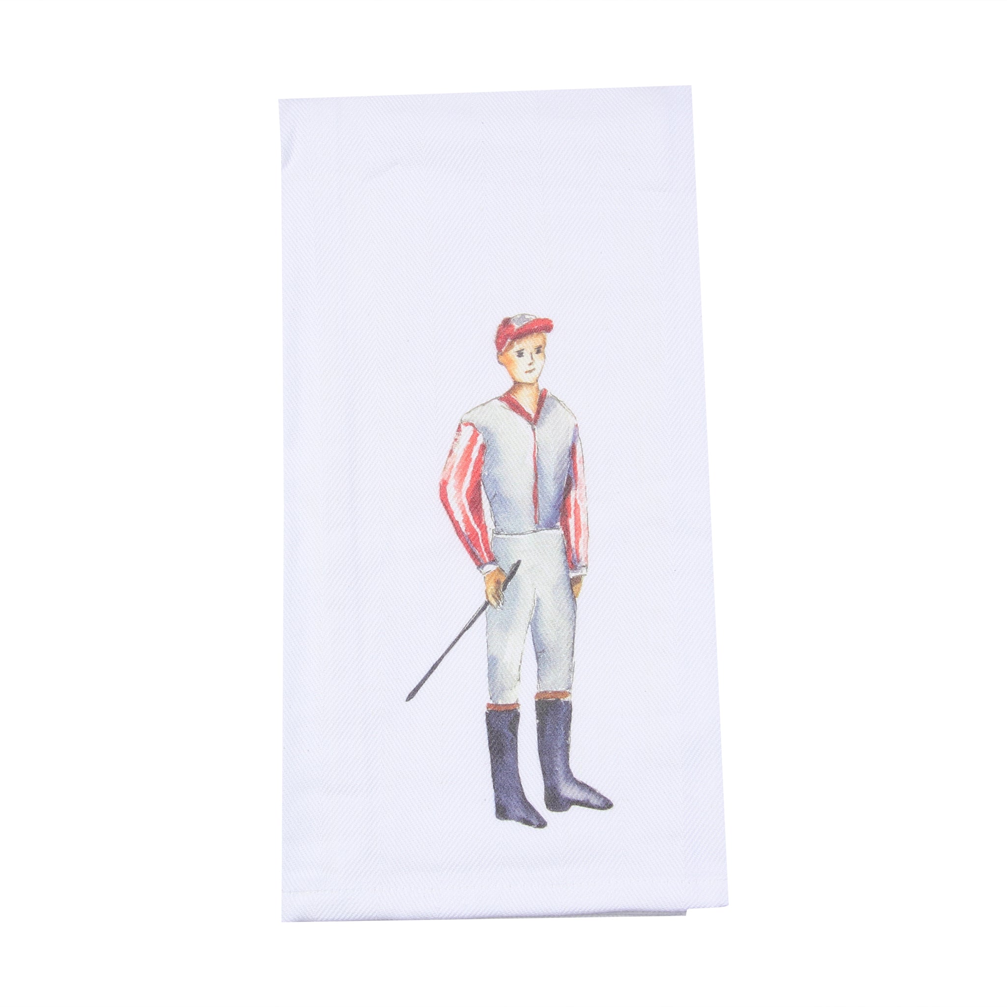 Celebrate racing tradition with this charming tea towel featuring an illustration of a jockey standing proudly in classic racing attire—a crisp white vest layered over a bold red striped undershirt. Perfect for horse racing fans and equestrian enthusiasts, this playful design captures the timeless elegance of the sport. The quality fabric is ideal for everyday kitchen use while the detailed artwork keeps your passion for the track on display. A stylish addition that brings the pageantry and heritage of horse racing into your home!