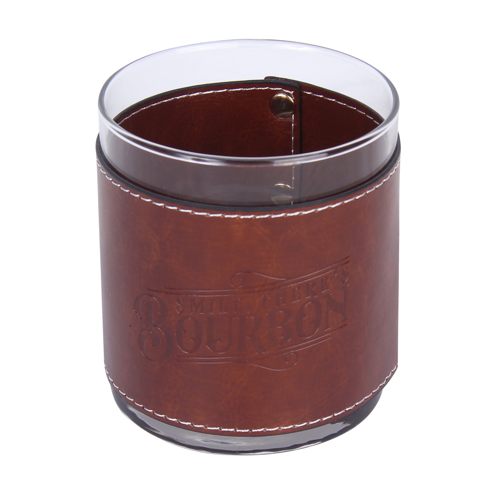 Raise a glass and your spirits with this charming Smile There's Bourbon Faux Leather Rocks Glass. Emblazoned with the cheerful reminder "smile, there's bourbon," it's the perfect companion for whiskey lovers with a sense of humor. The durable faux leather grip keeps your drink secure while adding a touch of rustic sophistication to your bar setup. Whether you're treating yourself or gifting a fellow bourbon enthusiast, this glass brings warmth and wit to every pour.