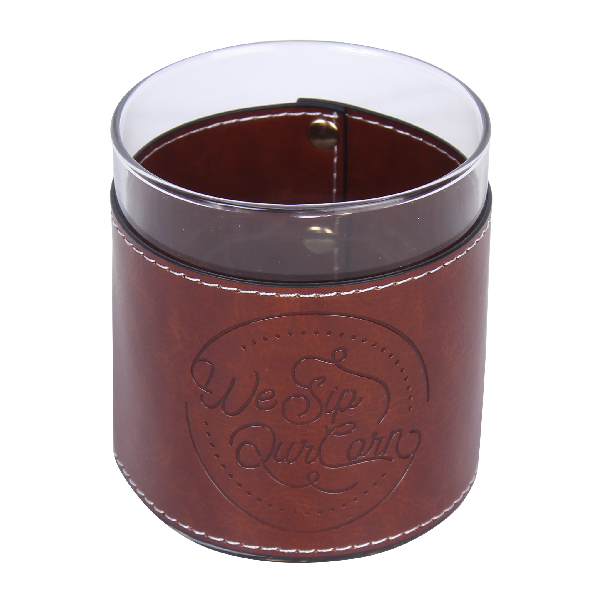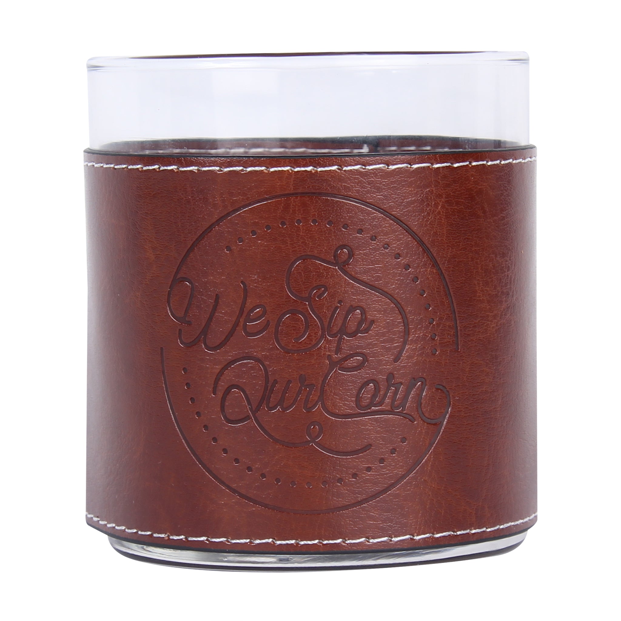 Raise a glass to Southern spirit with this cheeky We Sip Our Corn Faux Leather Rocks Glass. Wrapped in durable faux leather and emblazoned with the witty phrase "We Sip Our Corn," it's the perfect vessel for whiskey, bourbon, or your favorite spirit. Whether you're toasting with friends or treating yourself, this playful drinkware adds a touch of humor to happy hour. A must-have for anyone who appreciates good drinks and even better laughs.