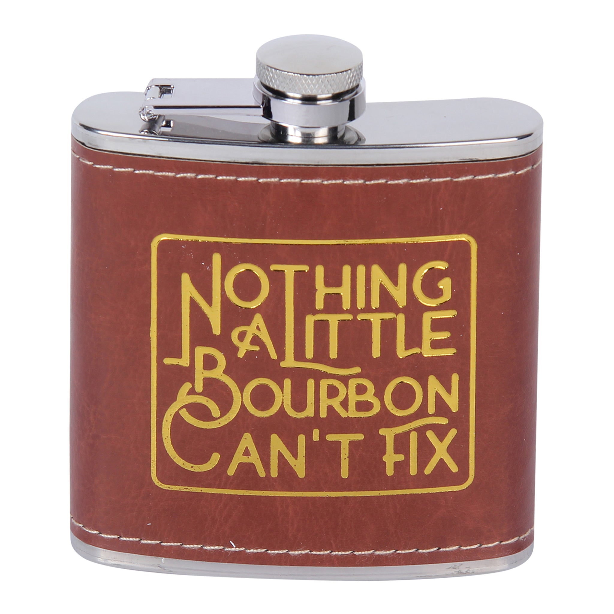 Carry your favorite spirit in style with this cheeky Nothing A Little Bourbon Can't Fix Bourbon Flask. The gold-stamped motto "Nothing a little bourbon can't fix" adds a touch of humor to your collection, making it perfect for whiskey lovers with a sense of wit. Durable faux leather construction keeps your drink secure while the sleek design fits easily into bags or back pockets. Whether you're heading to a tailgate, camping trip, or just need a laugh, this flask combines practicality with personality.