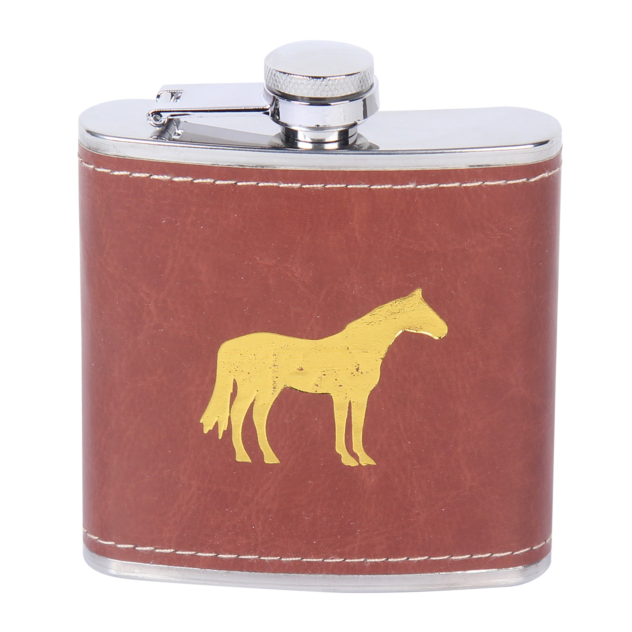 Saddle up for style with this charming Standing Horse Flask, complete with a striking gold foil stamp of a standing horse. Perfect for sipping your favorite spirits at the ranch, tailgate, or anywhere adventure calls. The durable faux leather construction keeps your drink secure while the eye-catching equestrian design adds a touch of Southern charm to any outing. Compact enough to slip into a pocket, bold enough to turn heads.