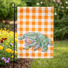 Add some bite to your outdoor décor with this spirited Orange Plaid Alligator FL Garden Flag Featuring a hand-drawn alligator chomping down on a football while wearing a checkered bandana, the design pops against a bold orange-and-white checkered background. Perfect for porches, yards, or tailgate setups, this flag brings playful energy and bold spirit to any game day or everyday display.