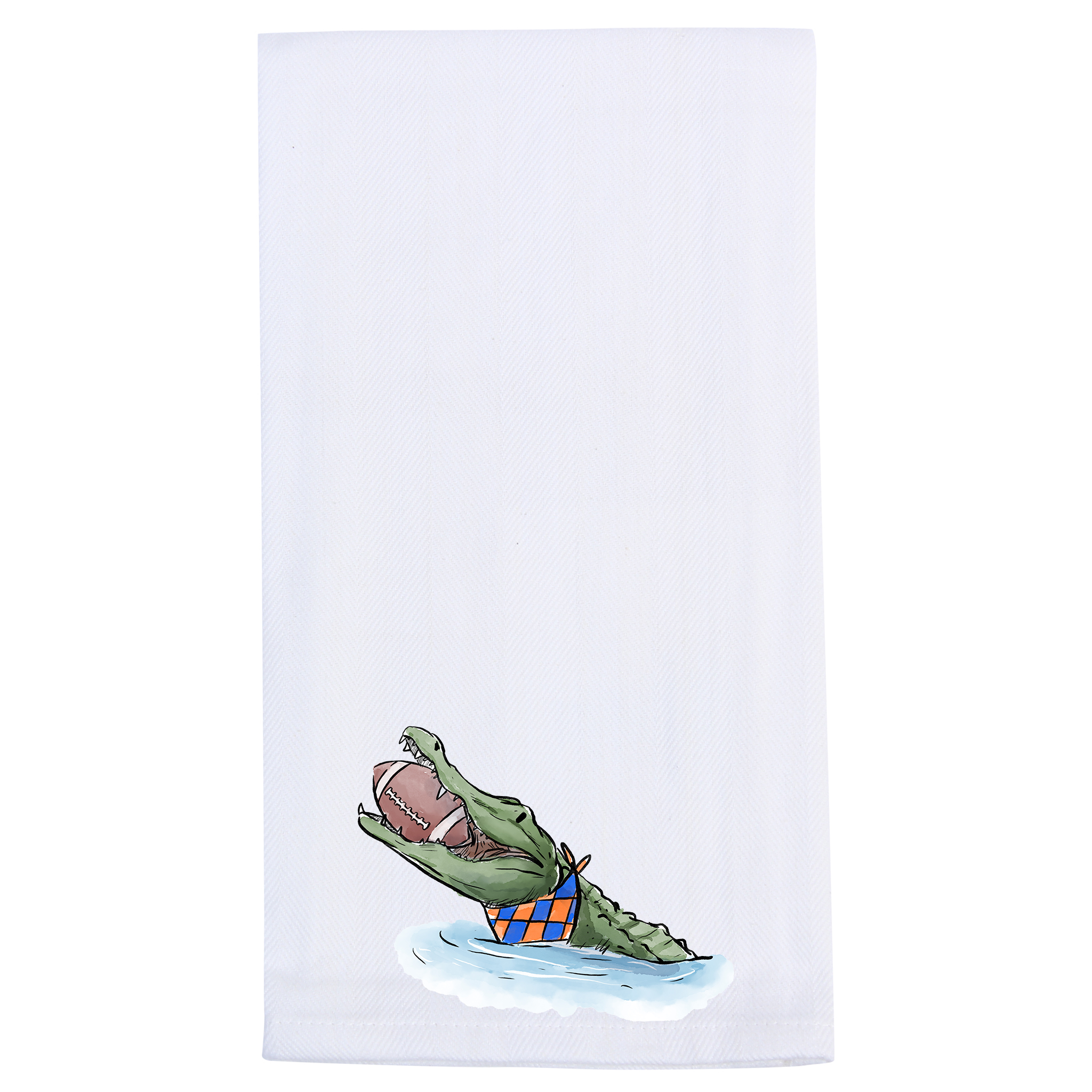 Add a splash of fun to your kitchen with this Alligator Head Tea Towel, featuring a cheeky alligator clutching a football in its mouth. Perfect for fans of the swamp and game day alike, this towel brings a playful twist to your everyday chores while showing off your spirited side.