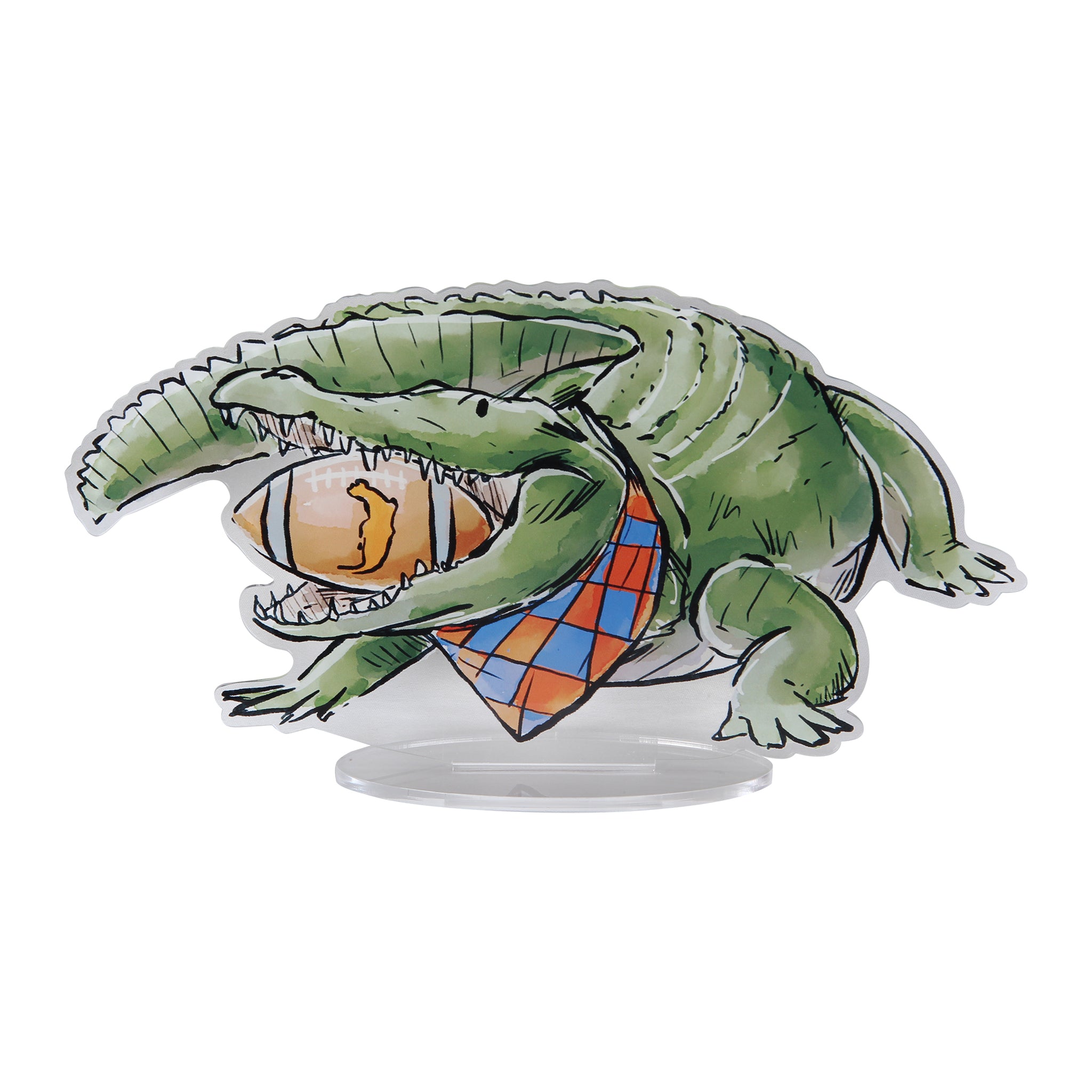 Show your Florida pride with this bold Alligator with Football in Mouth Acrylic Standee featuring a fierce gator gripping a football. Illustrated in a watercolor style, the design highlights a green alligator wearing an orange-and-blue checkered bandana while chomping down on a football marked with the state outline. Crafted from high-quality acrylic, this standee measures approximately 8 inches at the longest point and is scaled proportionally for display. Perfect for desks, shelves, or display cases, it’s a spirited collectible that combines football passion with Southern grit.