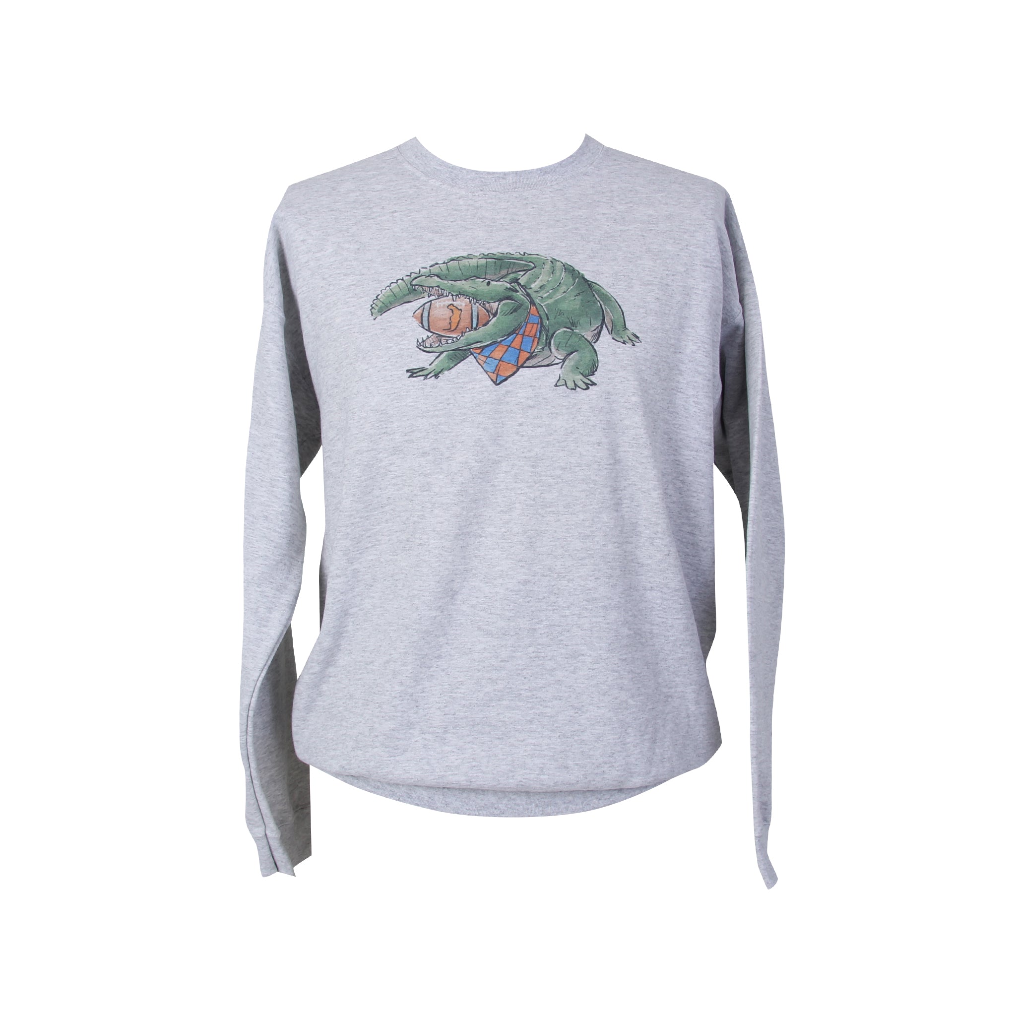 Rep your team in style with this cozy heather gray crewneck featuring a watercolor-style gator clutching a football and wearing a blue and orange checkered bandana. The playful design captures the perfect mix of Southern charm and game-day energy — ideal for fans who love a little bite with their football spirit.