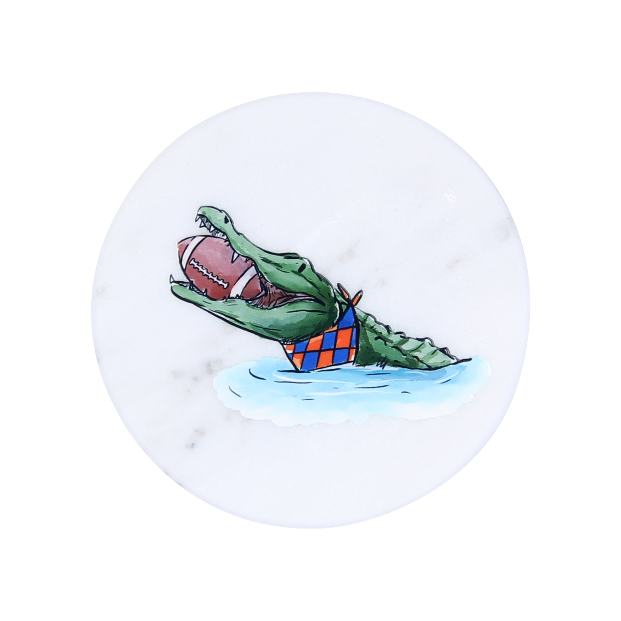 Show your Florida pride with this vibrant Gator marble coaster, perfect for fans of swimming and football alike. Crafted from durable marble, it protects your surfaces while adding a spirited touch to any room. Ideal for game days or everyday use, this coaster combines functionality with team spirit to keep your drinks safe and your fandom on display.