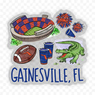 Celebrate football season in Gainesville, Florida, with this bold and colorful game day sticker. Featuring hand-drawn illustrations of a stadium, alligator, pom-poms, megaphone, football, and state-themed cups, it’s perfect for adding a splash of hometown pride to your gear.