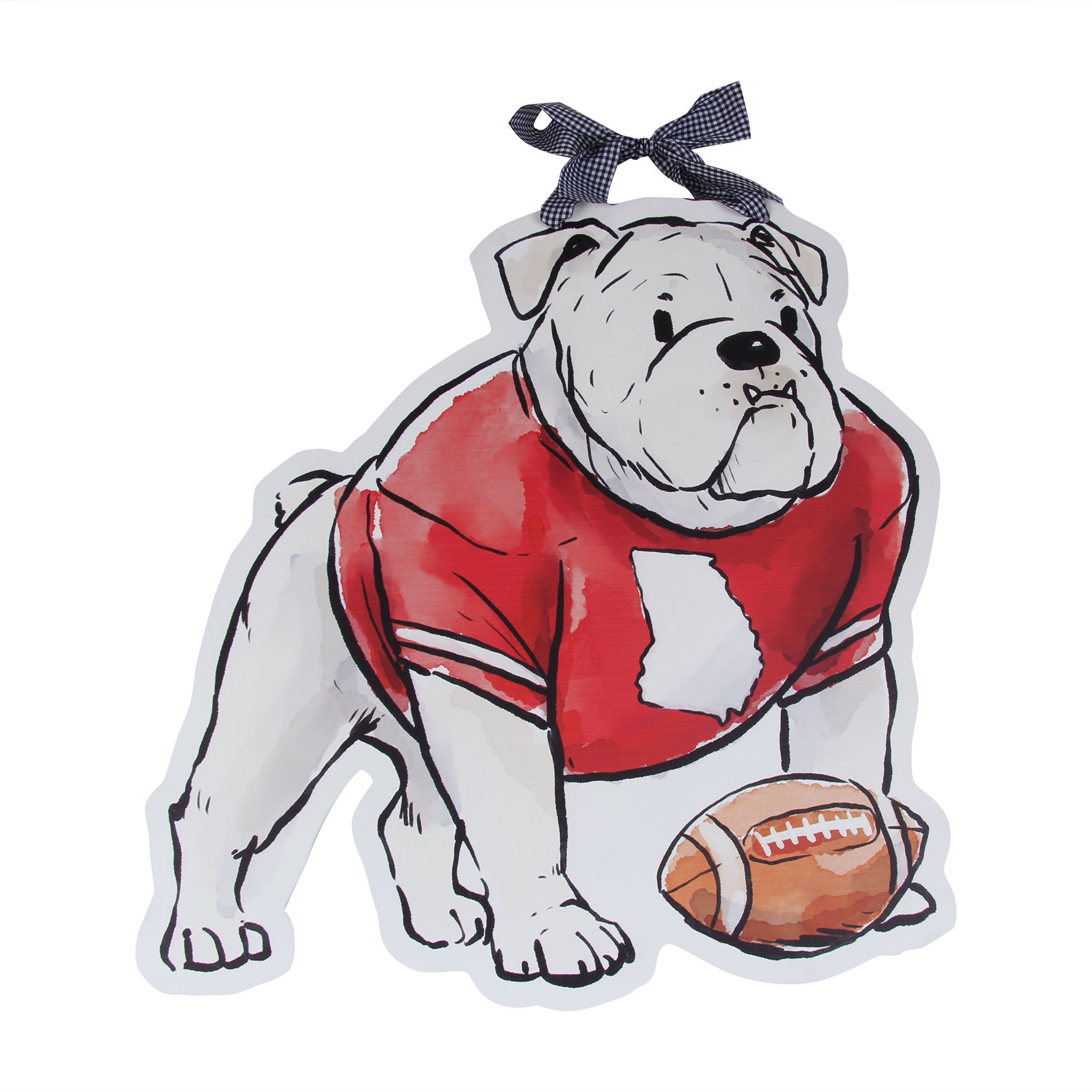Crafted from wood, this Bulldog Door Hanger measures 18.5 inches long and 19.5 inches wide—perfect for adding a fun, furry welcome to your door!