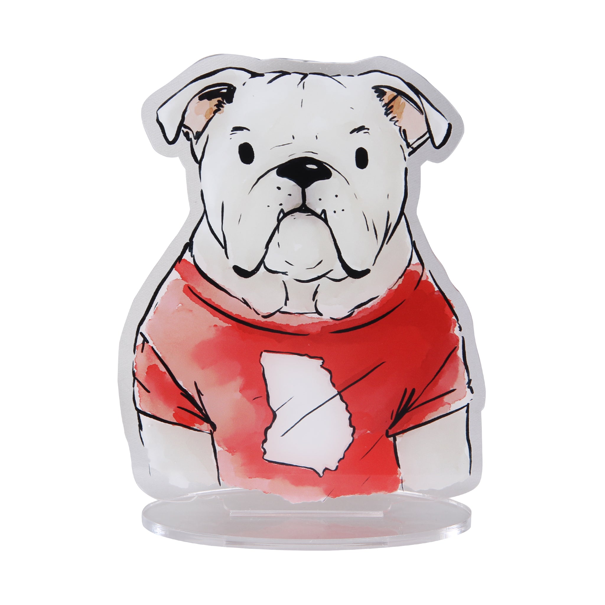 Celebrate Georgia spirit with this Bulldog Front Acrylic Standee featuring a proud bulldog in a red shirt stamped with the state outline. Illustrated in a watercolor style, this piece blends school pride, Southern tradition, and a touch of playful charm, making it a standout addition to any collection. At approximately 8 inches at the longest point and scaled proportionally, it’s made from premium acrylic for a polished and durable finish. Perfect for desks, bookshelves, or display cases, this collectible is ideal for both bulldog lovers and Georgia fans alike.