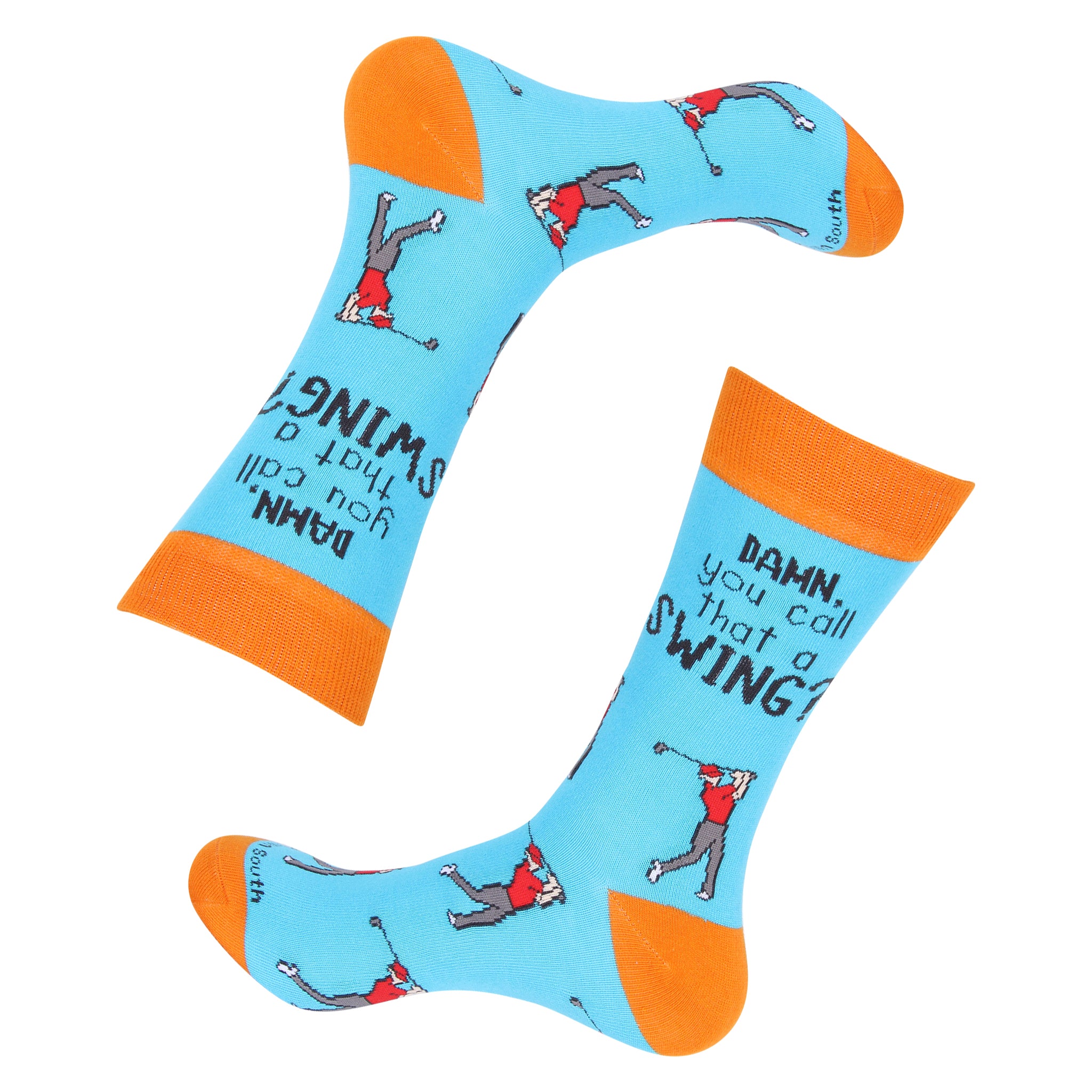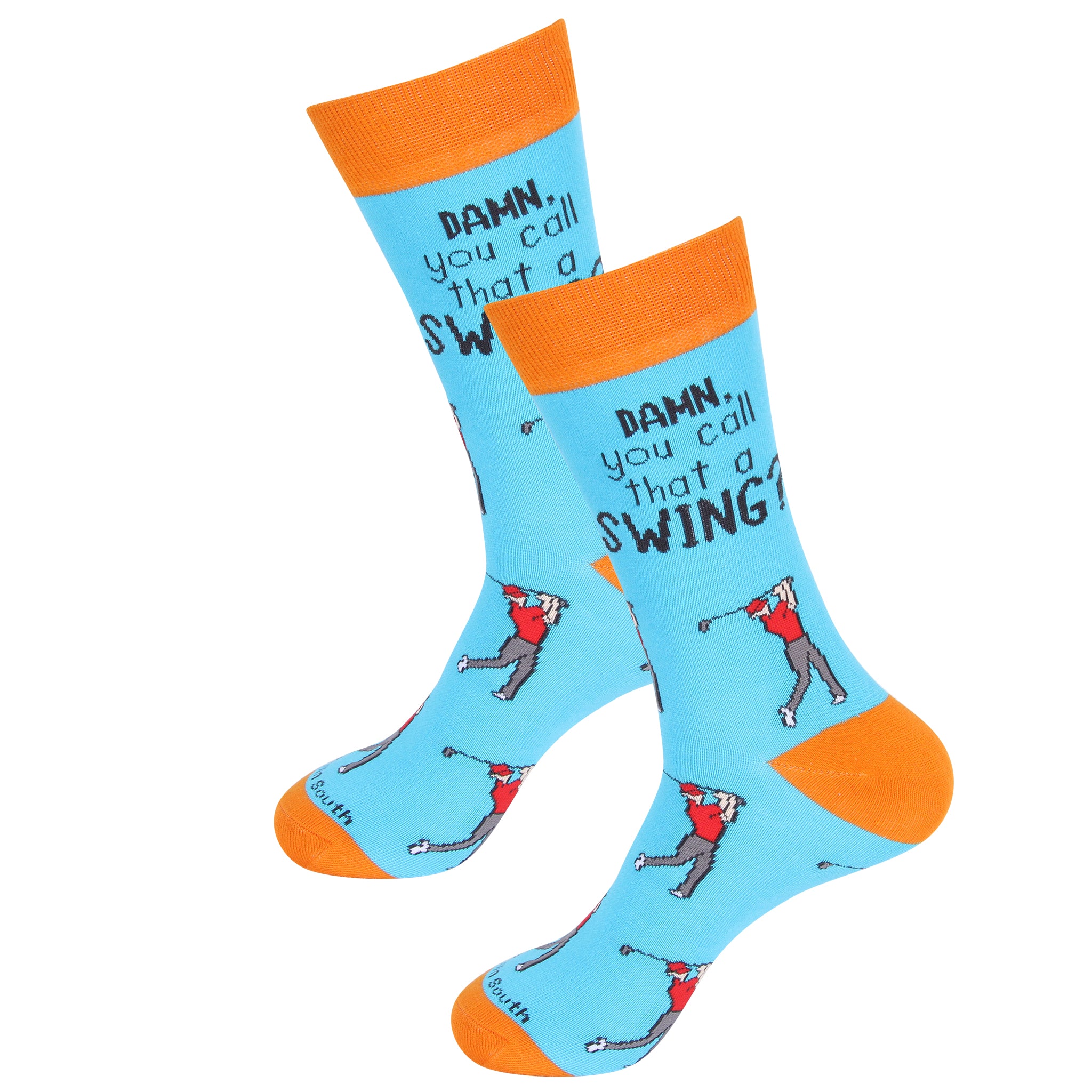 Bring humor to the fairway (or your sock drawer) with these hilarious Damn You Call That A Swing Golf Socks, featuring a repeating pattern of golfers mid-swing under the bold phrase, “Damn, you call that a swing?” Designed for golf enthusiasts with a sense of humor, these socks are a hole-in-one for casual rounds, clubhouse hangs, or gifting your favorite weekend duffer.