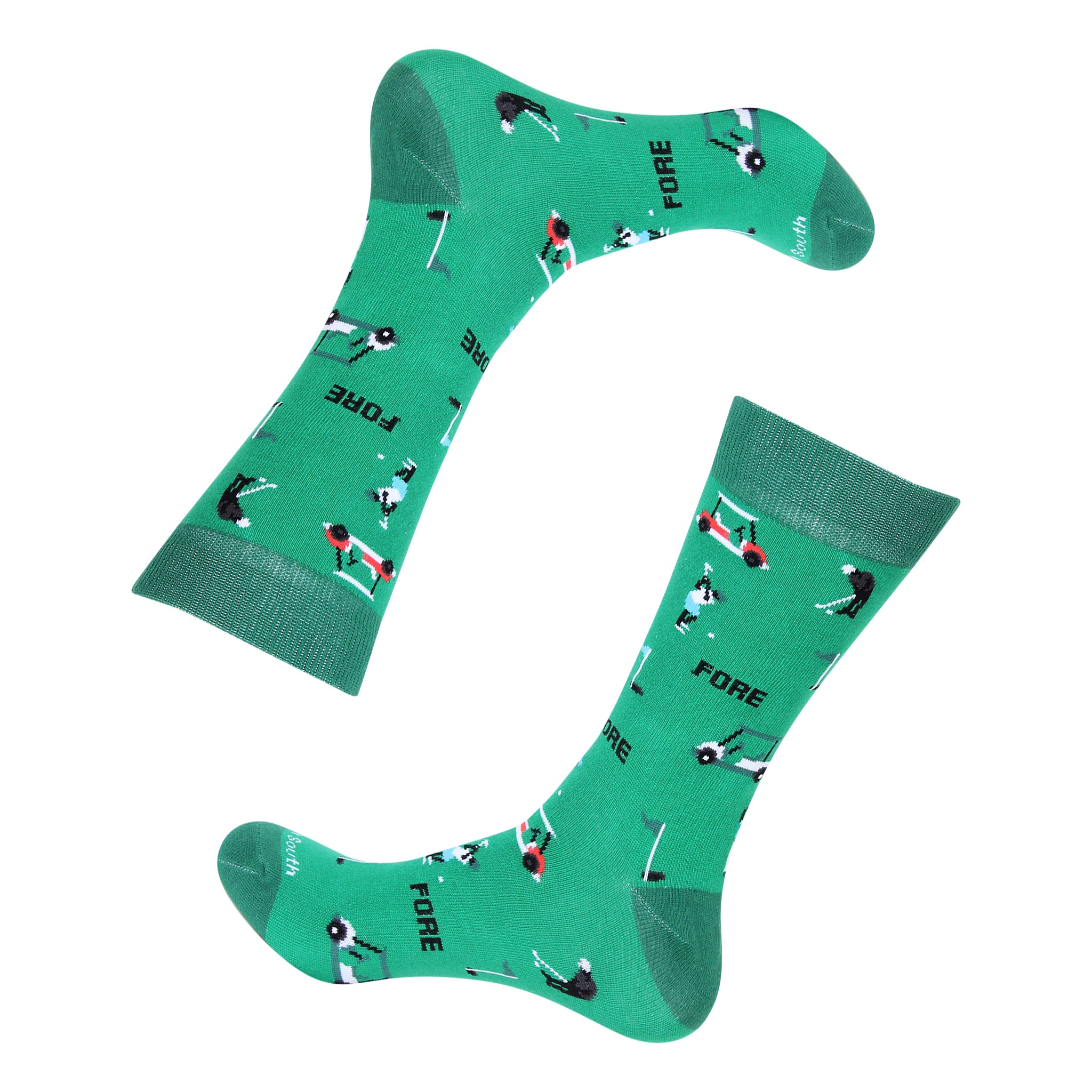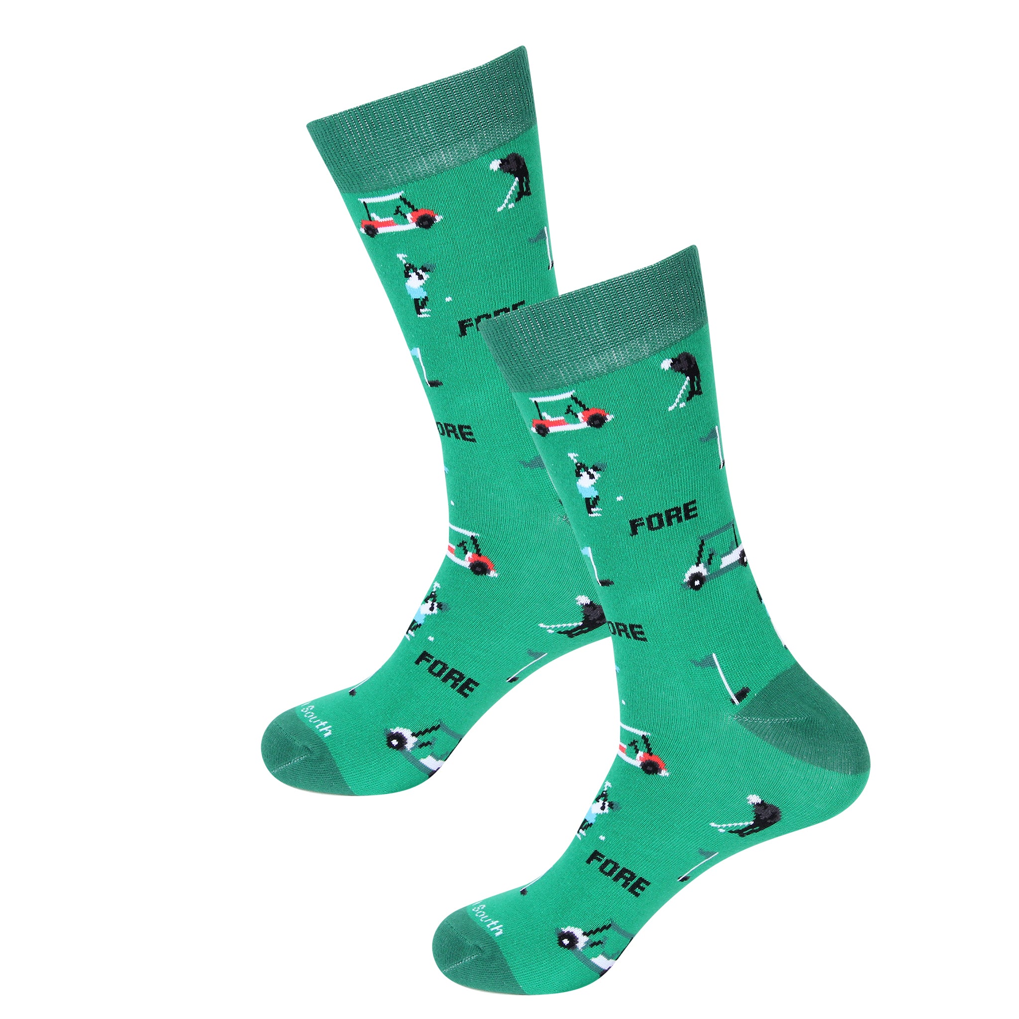 Step up your style on and off the course with the FORE Golf Socks, featuring a fun and dynamic repeating pattern of the word "FORE," golf carts, and players mid-swing. Perfect for golf lovers with a sense of humor and a love for bold accessories, these socks bring playful energy to every round—whether you're hitting the green or just dreaming about it.